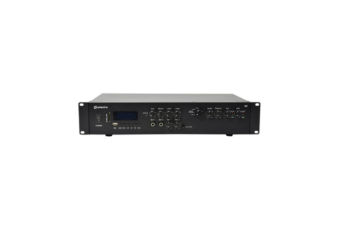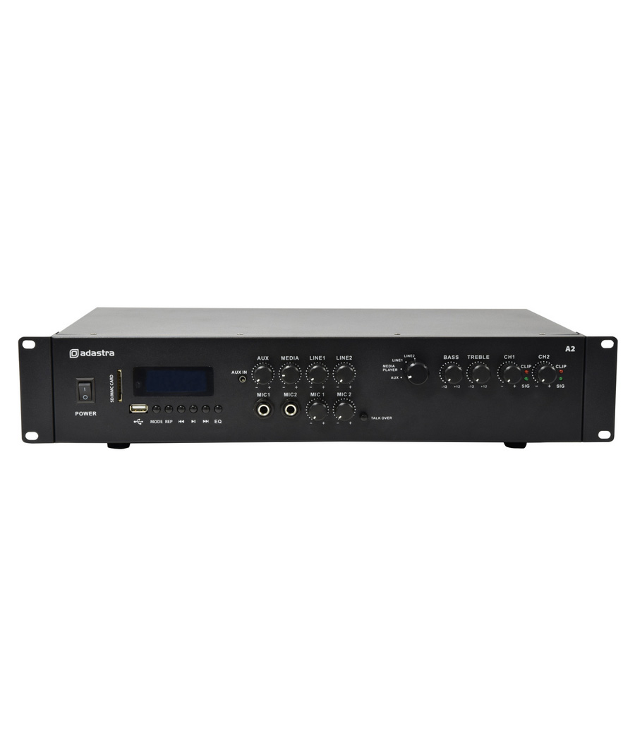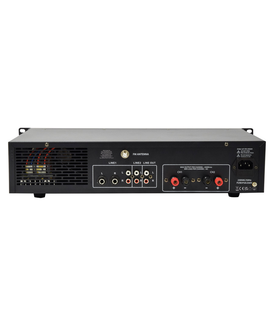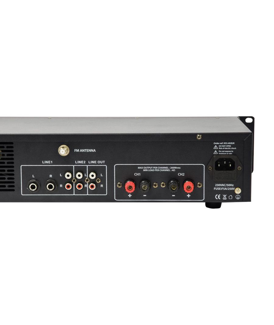 Πλήρως εξοπλισμένος στερεοφωνικός ενισχυτής με τμήμα μίκτη για 2 μικρόφωνα και στερεοφωνική πηγή ήχου.Μια ενσωματωμένη ενότητα αναπαραγωγής πολυμέσων προσφέρει αναπαραγωγή ήχου mp3 από μονάδα USB ή κάρτα SD και διαθέτει επίσης δέκτη Bluetooth και δέκτη ραδιοφώνου FM.Ένας περιστροφικός διακόπτης επιλέγει ανάμεσα σε 2 πίσω στερεοφωνικές εισόδους, μια μπροστινή στερεοφωνική είσοδο 3,5 mm ή την ενσωματωμένη συσκευή αναπαραγωγής πολυμέσων.Οι συνδέσεις των ηχείων στο πίσω πάνελ γίνονται μέσω συνδετικών στύλων 4 mm, οι οποίοι μπορούν να οδηγήσουν έως και 2 x 8 Ohm ηχεία ανά κανάλι για απόδοση 2 x 200 W.Σχεδιασμένο για να προσφέρει στους εγκαταστάτες μια ευέλικτη λύση για P.A.και αναπαραγωγή μουσικής σε μπαρ, εστιατόρια και αίθουσες εκδηλώσεων.Media player με αναπαραγωγή USB/SDΡαδιοφωνικός δέκτης FM με σύνδεση εξωτερικής κεραίαςΔέκτης BluetoothΧαρακτηριστικά: