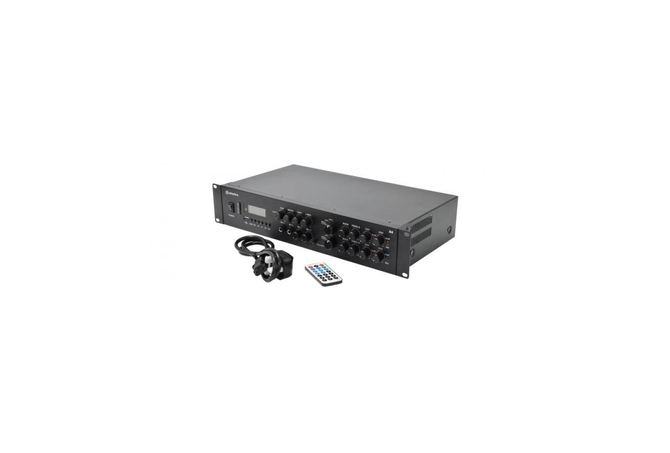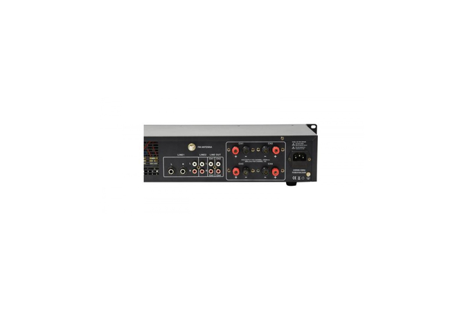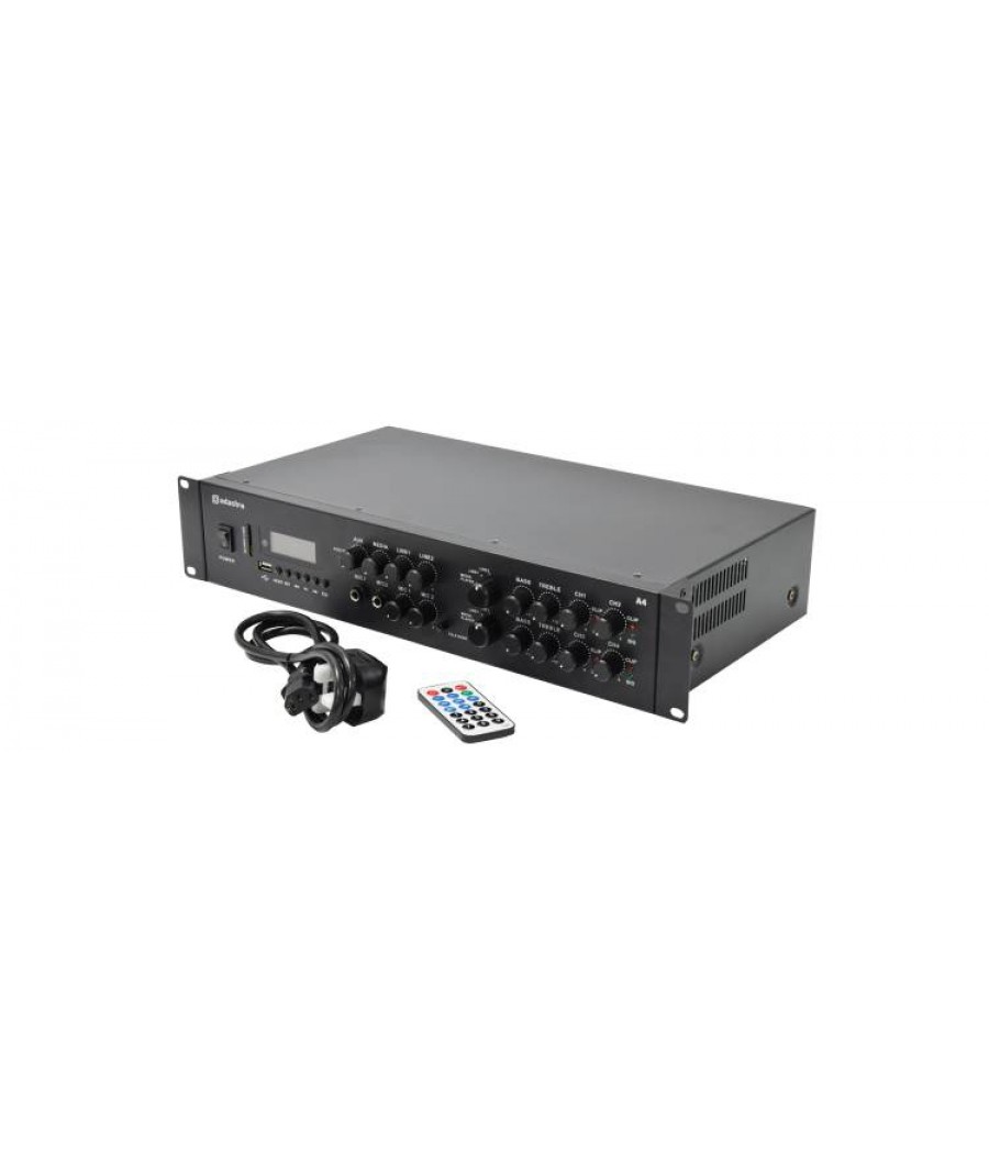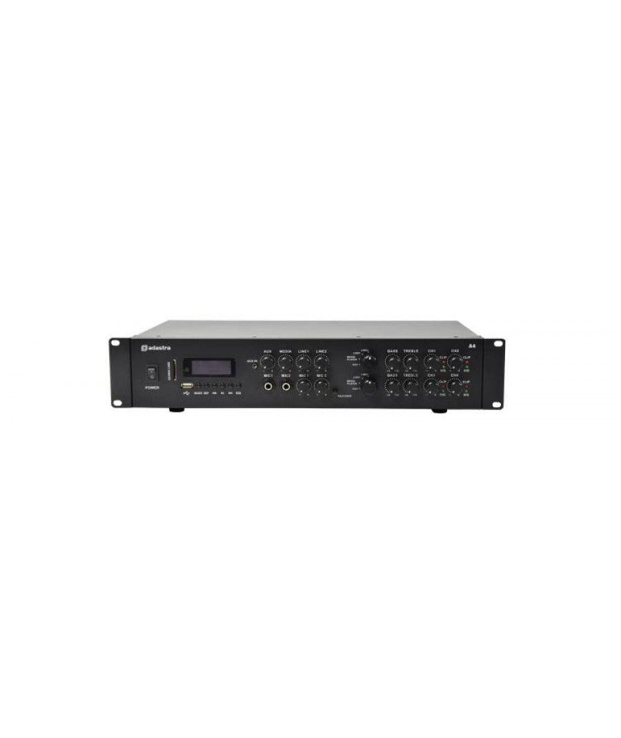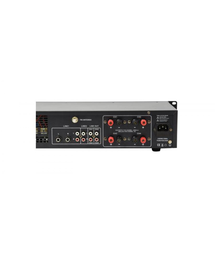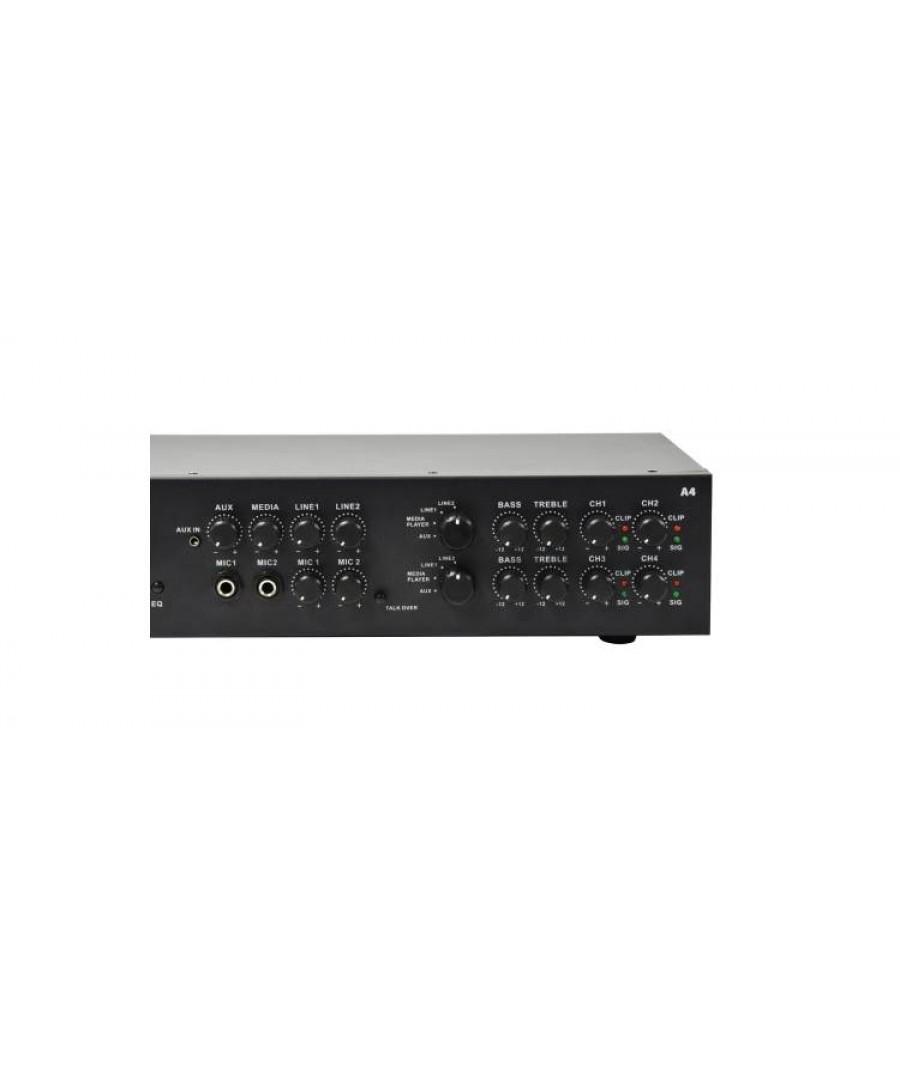 Πλήρως εξοπλισμένος ενισχυτής PA με 2 ανεξάρτητες εξόδους στερεοφωνικής ζώνης και μίκτη για 2 μικρόφωνα και στερεοφωνική πηγή ήχου. Ένα σύστημα αναπαραγωγής πολυμέσων που προσφέρει αναπαραγωγή μουσικών κομματιών mp3 από μονάδα USB ή κάρτα SD και διαθέτει επίσης δέκτη Bluetooth και δέκτη ραδιοφώνου FM. Ένας περιστροφικός διακόπτης για κάθε ζώνη εξόδου επιλέγει τον στερεοφωνικό ήχο αναπαραγωγής από μια επιλογή 2 στερεοφωνικών εισόδων πίσω, μια μπροστινή στερεοφωνική είσοδο 3,5mm ή την ενσωματωμένη συσκευή αναπαραγωγής πολυμέσων (media player). Οι είσοδοι μικροφώνου 1 και 2 είναι για ζωντανή μετάδοση και στις δύο ζώνες εξόδου ανά πάσα στιγμή. 2 ζεύγη συνδέσεων ηχείων στον πίσω πίνακα είναι μέσω συνδέσμων 4 mm, οι οποίοι μπορούν να οδηγήσουν έως και 2 x 8 Ohm ηχεία σε καθένα από τα 4 κανάλια για παροχή έως και 4 x 200W. Σχεδιασμένο για να προσφέρει ένα ολοκληρωμένο PA διπλής ζώνης για μπαρ, εστιατόρια και αίθουσες εκδηλώσεων.