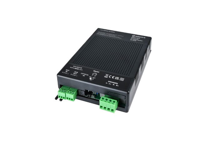 Μονάδα στερεοφωνικού ενισχυτή για μουσική υπόκρουση (background music) και public address σε μινιμαλιστικό περίβλημα για εγκατάσταση σε τοίχους και οροφές. Ο σχεδιασμός του ενισχυτή κατηγορίας D λειτουργεί καθαρά και αποτελεσματικά με ελάχιστη απαγωγή θερμότητας, σε συνδυασμό με ένα εσωτερικό τμήμα τροφοδοσίας ψηφιακής λειτουργίας διακόπτη, το οποίο επιτρέπει την εύκολη σύνδεση απευθείας από την τοπική παροχή ρεύματος. Η συμβατότητα Bluetooth επιτρέπει την ασύρματη ροή αρχείων ήχου από ένα smartphone ή άλλη ενεργοποιημένη συσκευή, εκτός από την είσοδο Aux 3,5 mm και μια οπτική είσοδο ψηφιακού ήχου, ιδανική για ενσωμάτωση σε συστήματα A-V. Για διακριτική και χωρίς προβλήματα εγκατάσταση, αυτοί οι ενισχυτές μπορούν να συνδυαστούν με πολλούς διαφορετικούς τύπους ηχείων για να παρέχουν το ιδανικό σύστημα ήχου για οποιονδήποτε μικρό έως μεσαίο χώρο ή να αναπτυχθούν για να δημιουργήσουν μια εγκατάσταση ήχου ευρείας περιοχής.Fig.8 είσοδος τροφοδοσίας δικτύουΔιακόπτης ενεργοποίησης/απενεργοποίησης BluetoothΟπτική είσοδος ψηφιακού ήχουΣτερεοφωνική είσοδος και έξοδος Aux 3,5 mmΕνσωματωμένος κύριος έλεγχος έντασης ήχουBluetooth με μοναδικό σειριακό αναγνωριστικό