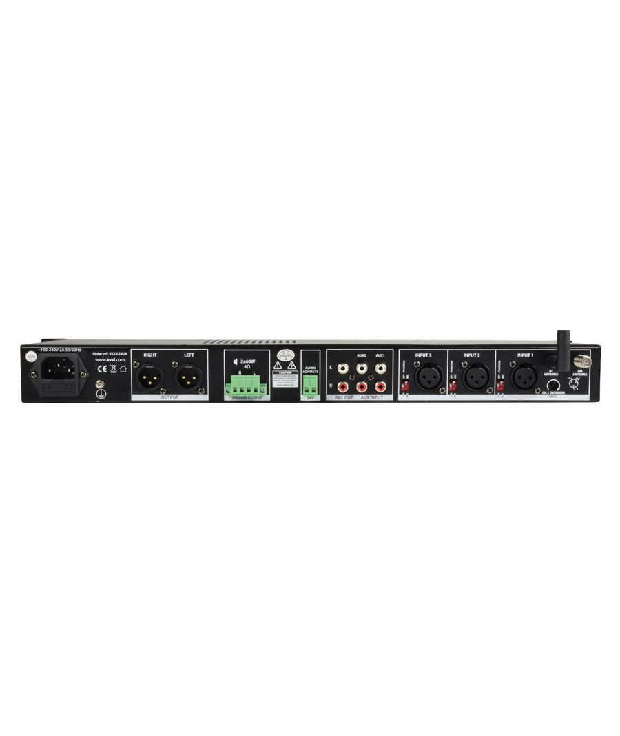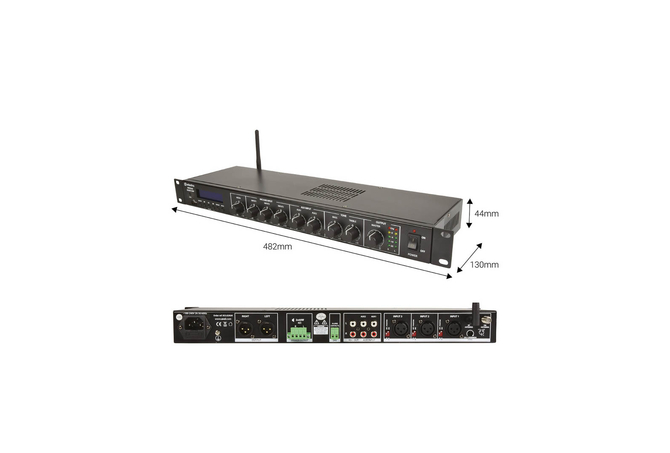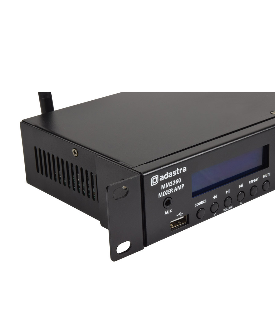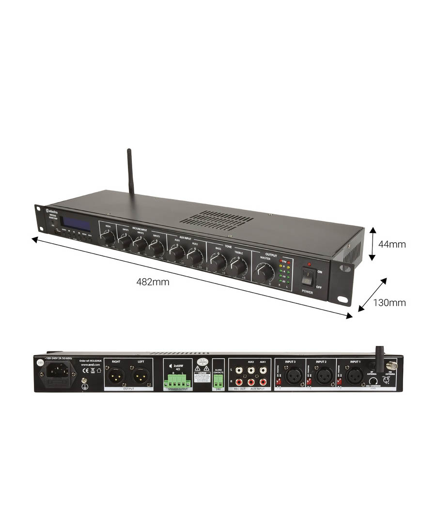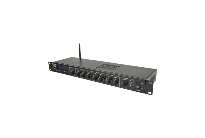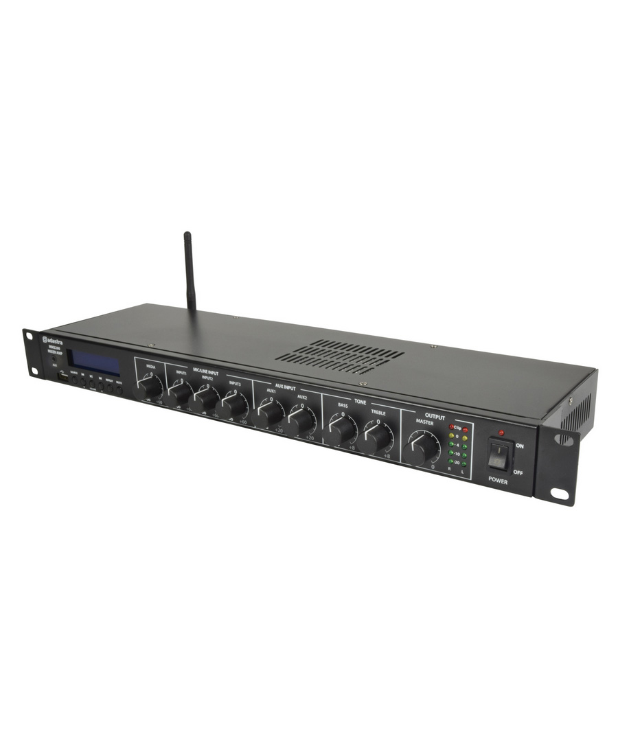 Ενισχυτής μίκτη 1U με δυνατότητα τοποθέτησης σε rack με ενσωματωμένη συσκευή αναπαραγωγής πολυμέσων και δέκτη Bluetooth.3 μονοφωνικές είσοδοι συνδέονται μέσω μικροφώνου XLR ή εισόδου Line (με δυνατότητα εναλλαγής).Κάθε μία από αυτές τις εισόδους έχει δυνατότητα εναλλαγής +20V phantom power για χρήση με πυκνωτικά μικρόφωνα ή D.I.boxes και το κανάλι 1 έχει συνάρτηση μεταβλητής προτεραιότητας.Δύο στερεοφωνικές βοηθητικές είσοδοι γραμμής παρέχονται σε υποδοχές RCA με έξοδο στερεοφωνικής εγγραφής.Οι λειτουργίες αναπαραγωγής πολυμέσων περιλαμβάνουν είσοδο Aux 3,5 mm, συσκευή αναπαραγωγής ήχου USB, δέκτη ραδιοφώνου FM και δέκτη Bluetooth για αναπαραγωγή από smart phone ή tablet.Οι κύριες έξοδοι αριστερού και δεξιού ηχείου συνδέονται μέσω βιδωτών ακροδεκτών τύπου Euroblock και το σήμα γραμμής τροφοδοτείται στις εξόδους L+R XLR. Ιδανικό για μουσική υπόκρουση και ανακοινώσεις τοπικής περιοχής ή συνδεδεμένο σε περαιτέρω ενισχυτές για μεγαλύτερες εγκαταστάσεις.2 x 60 Wrms σε 4 OhmBluetooth με προγραμματιζόμενο αναγνωριστικόMedia player με αναπαραγωγή USB και δέκτη FMΕναλλαγή +20V phantom powerΣίγαση μεταβλητής προτεραιότητας για το κανάλι 1Επαφές σίγασης έκτακτης ανάγκης 24VΧαρακτηριστικά: