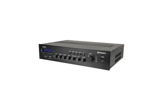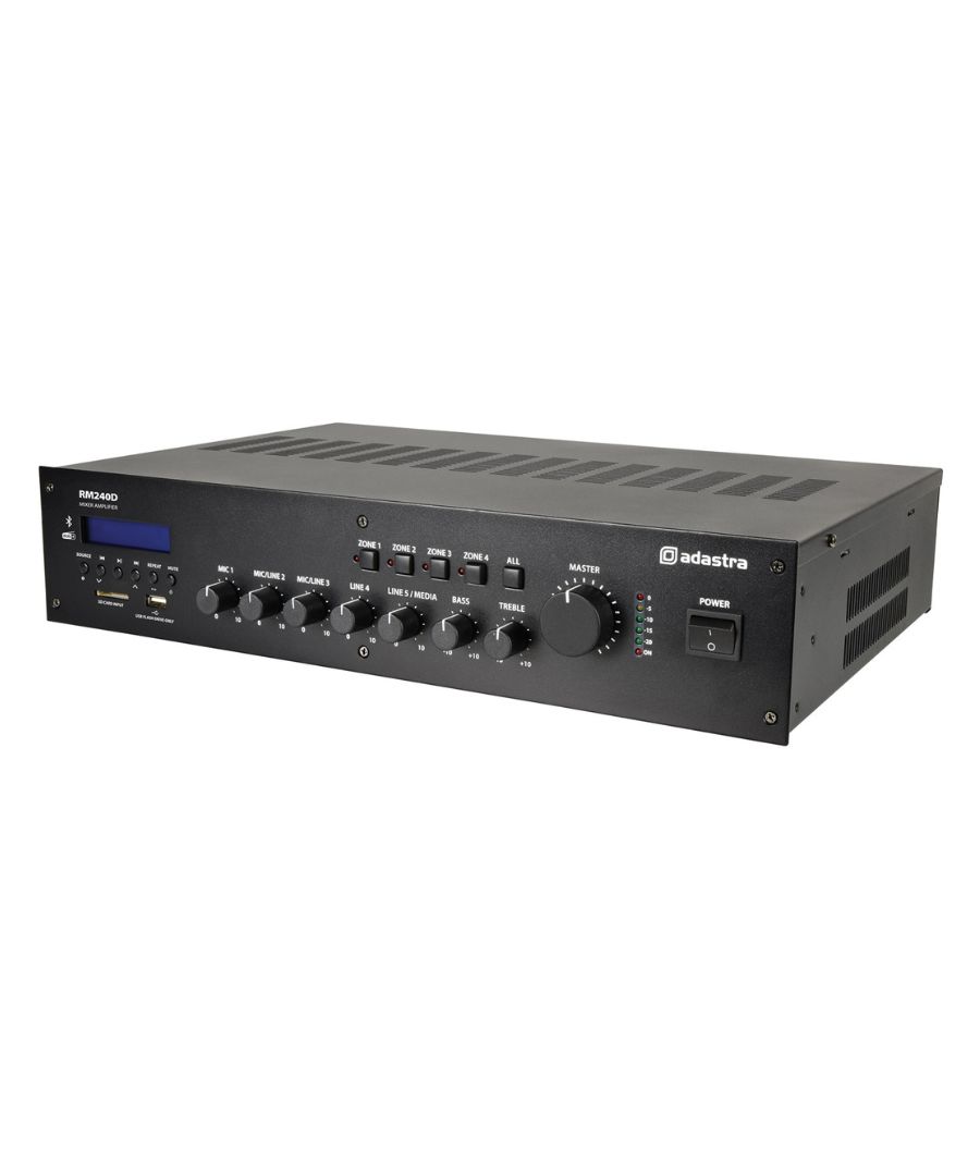 Μίκτης-ενισχυτής 5 καναλιών 19" με δυνατότητα τοποθέτησης σε rack, προσαρμοσμένος σε εμπορικές εγκαταστάσεις ήχου για να τροφοδοτεί ηχεία γραμμής 100 V ή τυπικά ηχεία μέχρι 4 Ohm. Οι επιλογές εισόδου περιλαμβάνουν XLR (με δυνατότητα εναλλαγής phantom power), υποδοχή μικροφώνου/γραμμής και RCA Διαθέτει ενσωματωμένο δέκτη ραδιοφώνου DAB+/FM, θύρες SD/USB στο μπροστινό μέρος και συνδεσιμότητα Bluetooth®, όλα ελεγχόμενα μέσω μιας ενσωματωμένης συσκευής αναπαραγωγής πολυμέσων για απρόσκοπτη αναπαραγωγή. Μια δυνατότητα εναλλαγής «voiceover» μειώνει αυτόματα την ένταση της μουσικής στο παρασκήνιο όταν ανιχνεύεται σήμα μέσω της mic input 1 και οι επαφές του πίσω πίνακα 24 V μπορούν να θέσουν σε σίγαση όλες εκτός από την είσοδο μικροφώνου 1. Οι έξοδοι στο βιδωτό τερματικό είναι μέσω 4 ζώνες μεταγωγής με ξεχωριστή έξοδο "πάντα ενεργοποιημένη" για ηχεία ειδοποίησης προτεραιότητας.Δέκτης ραδιοφώνου DAB+/FMΔέκτης Bluetooth με μοναδικό σειριακό IDUSB/SD συσκευή αναπαραγωγής ήχου4 εναλλασσόμενες εξόδους 100V και 1 έξοδος χωρίς διακόπτηΠροαιρετική έξοδος 4-16 OhmΕίσοδος XLR με δυνατότητα εναλλαγής +20V phantom power2 x είσοδοι μικροφώνου/γραμμής, 2 x είσοδοι γραμμής RCA, 1 x έξοδος γραμμής RCAΔυνατότητα εναλλαγής φωνής VOX2U 19" με δυνατότητα τοποθέτησης σε rack (παρέχονται αυτιά σε rack)Επαφές σίγασης έκτακτης ανάγκης 24VΕπιλογή ρεύματος 230Vac ή 24VdcΧαρακτηριστικά: