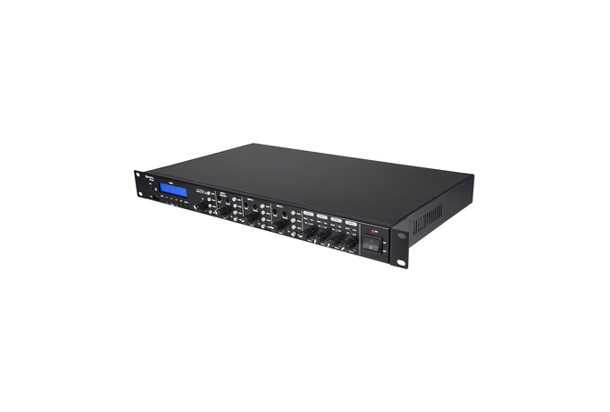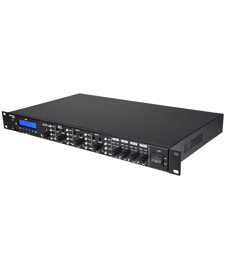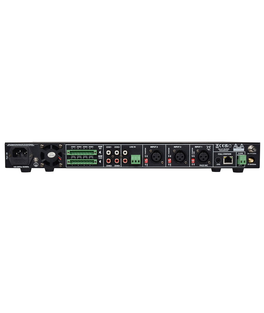 Τετραπλός ενισχυτής 1U 19" με δυνατότητα τοποθέτησης σε rack με 4 κανάλια εισόδου και 4 εξόδους ανεξάρτητων ηχείων. Κάθε έξοδος μπορεί να αποδώσει έως και 60 W σε ηχεία χαμηλής σύνθετης αντίστασης (4 ή 8 ohms) ή 100 V συνδέοντας είτε τους άνω ή κάτω βιδωτούς ακροδέκτες στο πίσω μέρος Μια εσωτερική συσκευή αναπαραγωγής πολυμέσων μπορεί να αναπαράγει αρχεία ήχου από μια μονάδα στυλό USB, να συντονιστεί σε ραδιοφωνικούς σταθμούς FM ή να συνδεθεί μέσω Bluetooth® σε ένα smartphone για ασύρματη αναπαραγωγή αποθηκευμένων κομματιών ήχου. Μια είσοδος μικροφώνου σελιδοποίησης διαθέτει λειτουργία εναλλαγής Vox για την παράκαμψη άλλων καναλιών. Μπορούν να επιλεγούν 2 επιπλέον ισορροπημένες είσοδοι για να δέχονται είσοδο μικροφώνου ή γραμμής με δυνατότητα εναλλαγής phantom power. Τα κανάλια 1 έως 3 διαθέτουν επίσης χειριστήρια Bass και Treble για ρύθμιση τόνου. Μια ξεχωριστή είσοδος γραμμής διαθέτει σύνδεση RCA ή βιδωτό τερματικό και, εάν απαιτείται, μπορεί μπορεί να αλλάξει για να εξυπηρετήσει την εσωτερική συσκευή αναπαραγωγής πολυμέσων. Κάθε μία από τις τέσσερις εισόδους μπορεί να επιλεγεί σε οποιαδήποτε ή και στις τέσσερις ζώνες εξόδου, η καθεμία με ξεχωριστό έλεγχο στάθμης εξόδου και έξοδο στάθμης γραμμής για επέκταση σε περαιτέρω ενίσχυση ifiers ή ηλεκτρικά ηχεία. Ένας προαιρετικός σταθμός κλήσης CS4 μπορεί να προστεθεί εάν απαιτείται συγκεκριμένη περιοχή σελιδοποίησης, παρέχοντας ένα πλήρως ανεξάρτητο και ευέλικτο σύστημα ζωνών για μουσική υπόκρουση, ηχογραφημένες πληροφορίες και ανακοινώσεις.4 ανεξάρτητοι ενισχυτές class-D 60WΠροαιρετικός σταθμός κλήσης - CS4 (953.146UK)Εσωτερική συσκευή αναπαραγωγής USB / FM / BluetoothΕπιλογές εξόδου 100V ή χαμηλής αντίστασηςΕπαφές 24V EMG σίγαση εισόδων 2-4Χαρακτηριστικά: