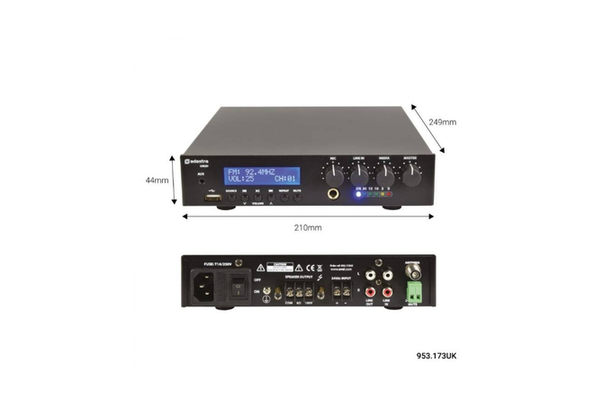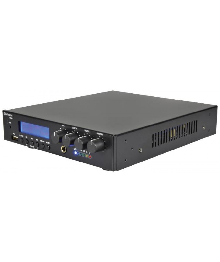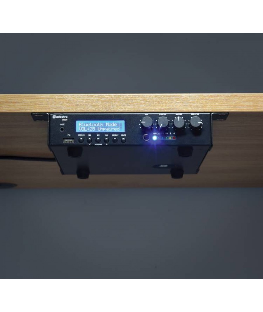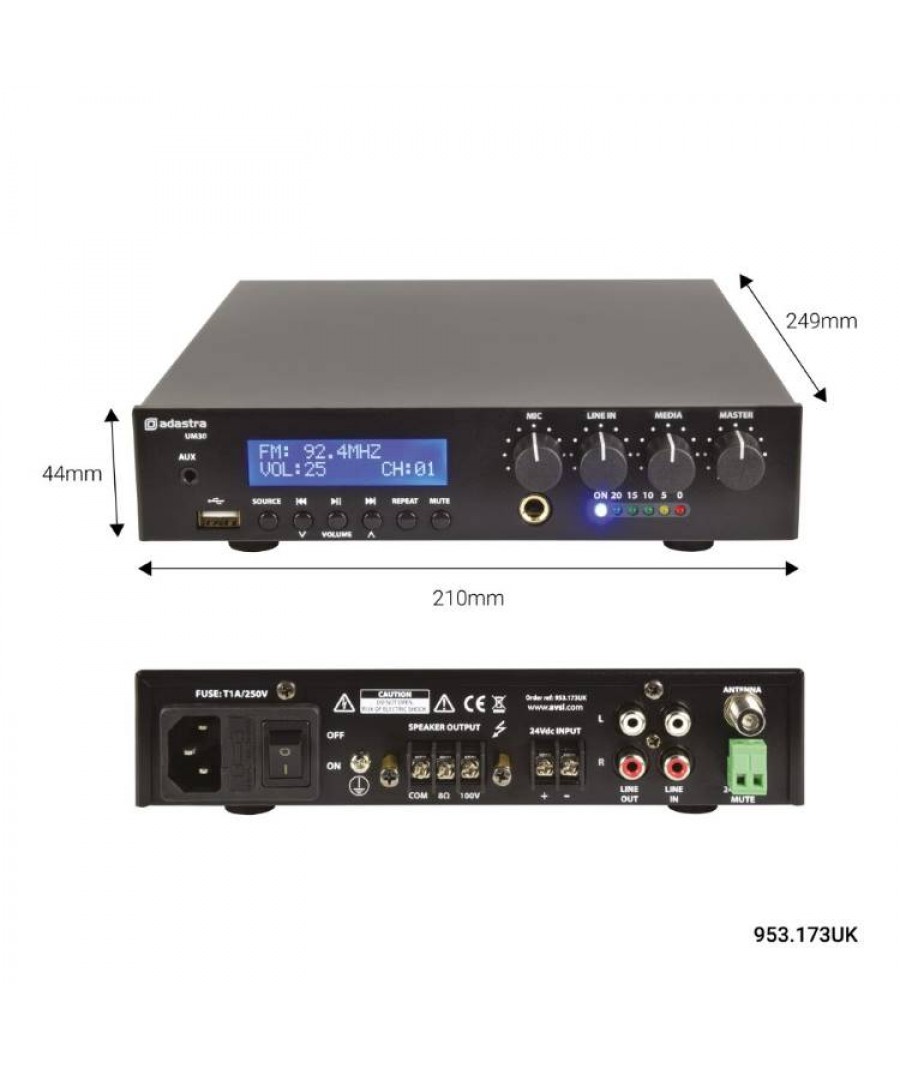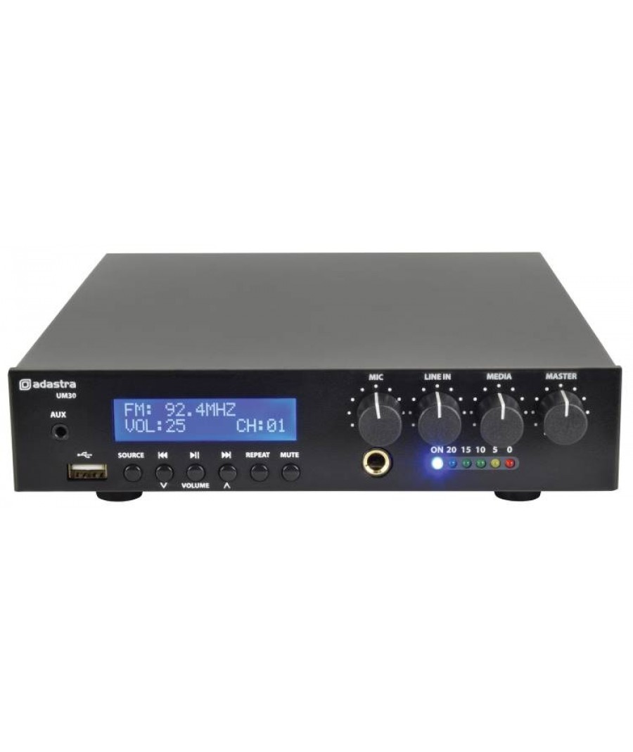 Ο UM30 της σειράς UM (Ultra Compact Mixer-Amplifiers 100V) της Adastra, είναι ένας ενισχυτής 100V με USB, δέκτη FM και ασύρματο δέκτη BT σε ένα εξαιρετικά συμπαγές περίβλημα. Η είσοδος μικροφώνου, η είσοδος γραμμής και τα τμήματα USB / FM / BT διέπονται από τα χειριστήρια έντασης του μπροστινού πίνακα και από την κεντρική ένταση. Η μονοφωνική έξοδος είτε σε γραμμή 100V είτε σε φορτίο ηχείων 8 Ohms συνδέεται μέσω βιδωτών ακροδεκτών στον πίσω πίνακα. Διατίθεται με υλικό για τοποθέτηση 2 μονάδων δίπλα-δίπλα σε χώρο ραφιού 1U 19". Σχεδιασμένο ως μια ευέλικτη λύση για μικρές έως μεσαίες εγκαταστάσεις PA.Εξαιρετικά συμπαγήςΑποτελεσματικός σχεδιασμός ενισχυτή κατηγορίας DΕσωτερική συσκευή αναπαραγωγής ήχου USB / FM / BTLine 100V ή λειτουργία 8 OhmsΧαρακτηριστικά: