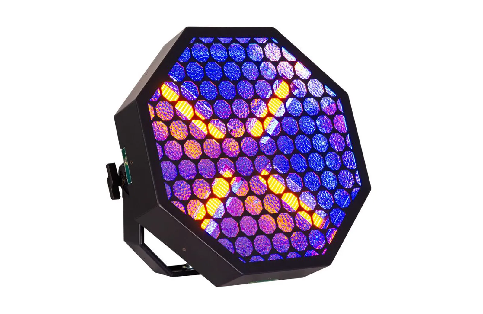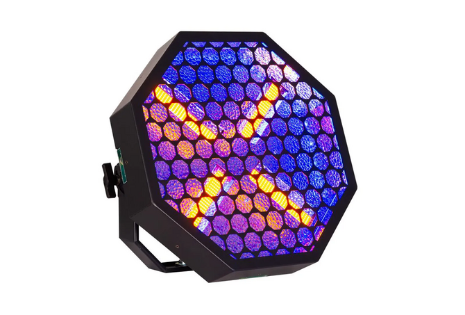 ADJ Vintage X, πολλαπλών ρόλων φωτιστικό σε σχήμα οκταγώνου, ιδανικό για σκηνικά, με σχεδιασμό διπλού σκοπού που περιλαμβάνει, 4 κεχριμπαρένια LEDs(2000K) των 60W εμπρός για ένα ζεστό κοκκινωπό φωτισμό και 64 έντονα RGB LEDs των 3W για δυναμικούς χρωματικούς τονισμούς και εφέ.