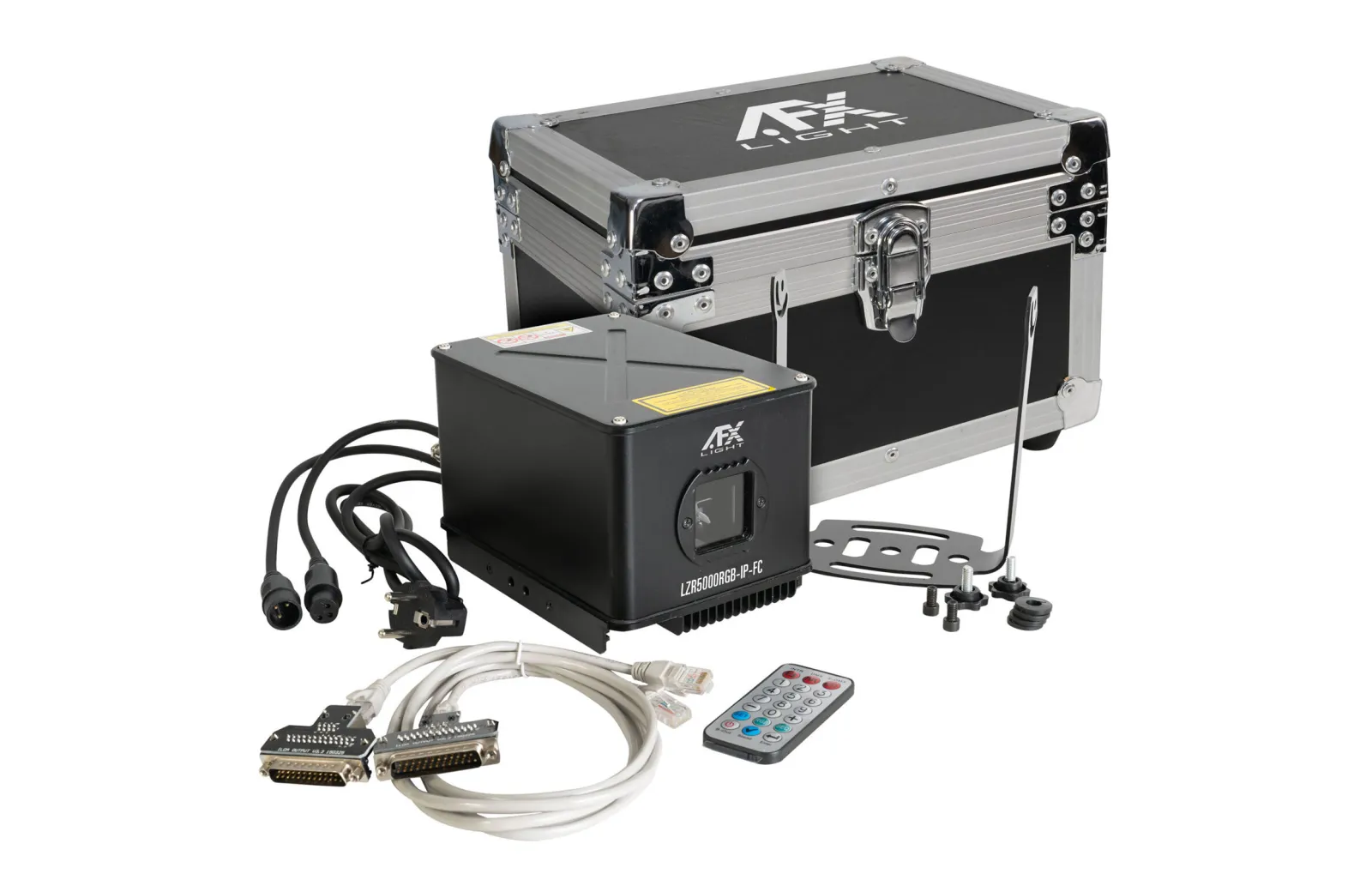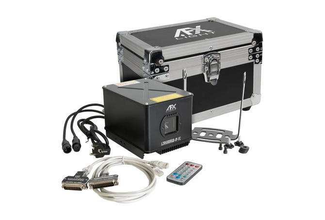 AFX Light LZR5000RGB-IP-FC, RGB laser με ισχύ 5W με έλεγχο DMX και πιστοποίηση IP65 με ενσωματωμένα εφέ που έρχεται μαζί με flightcase για την αποθήκευση και την μεταφορά του.