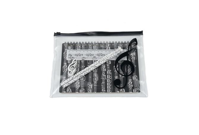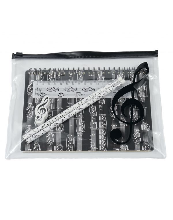 Σετ γραφικής ύλης Περιλαμβάνονται: Σημειωματάριο σε μορφή DIN A-5 με 60 σελίδες και με σχέδιο πεντάγραμμο x 1 Γόμα με σχέδιο κλειδί Σολ x 1 Xάρακας 15 cm με σχέδιο πεντάγραμμο x 1 Μολύβι x 2