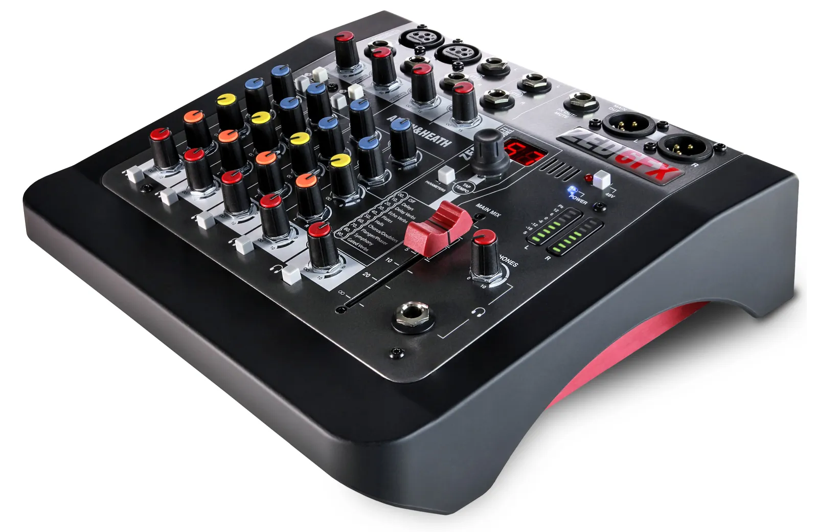 Allen & Heath ZED-6FX, αναλογική κονσόλα ήχου 6 καναλιών με εφέ επιπέδου στούντιο, 2 εισόδους μικροφώνου και line, 2 στερεοφωνικές εισόδους με TRS, 2 εισόδους Hi-Z για σύνδεση οργάνων, 48V Phantom Power για πυκνωτικά μικρόφωνα και EQ 2 περιοχών.
