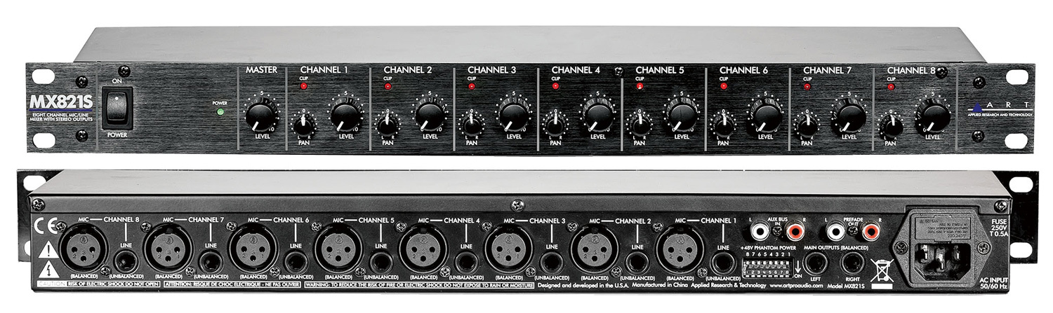 ο ART MX821S είναι rack mount μίκτης πολλαπλών εφαρμογών οκτώ αυτόνομων καναλιών εισόδων σε μια stereo line-level έξοδο. Κάθε κανάλι εισόδου μπορεί να δεχθεί balanced XLR είσοδου μικροφώνου ή unbalanced 1/4-inch TS line-level σήμα και παρέχει αυτόνομο έλεγχο level και pan .