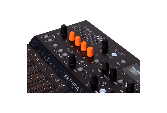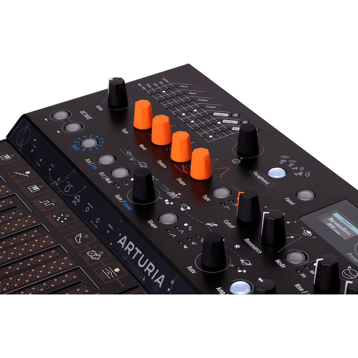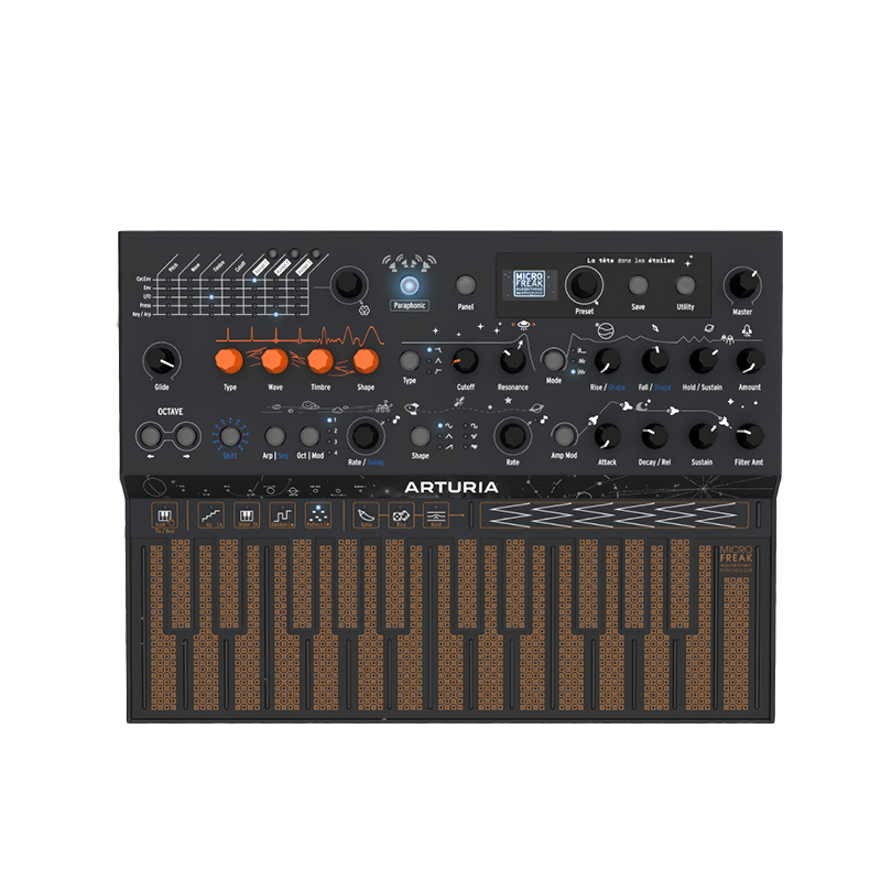 Το MicroFreak Stellar δεν διαθέτει απλώς ένα κομψό νέο γκρι εξωτερικό χρωματισμό. Ολόκληρη η διεπαφή είναι διάσπαρτη με μοναδικά διαστημικά γραφικά εμπνευσμένα από τα χειριστήρια του, από το ADSR με εικόνα εκτόξευσης πυραύλων, έως το φίλτρου συντονισμού με εικόνα UFO - δίνοντας σε αυτό το ήδη αξιαγάπητο synth ακόμα πιο μοναδικό χαρακτήρα!