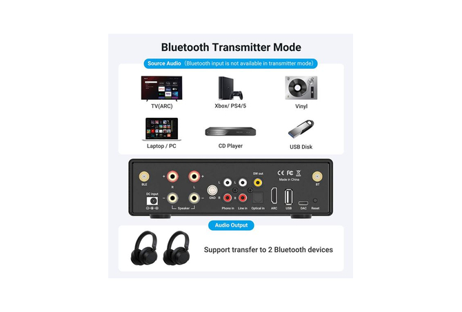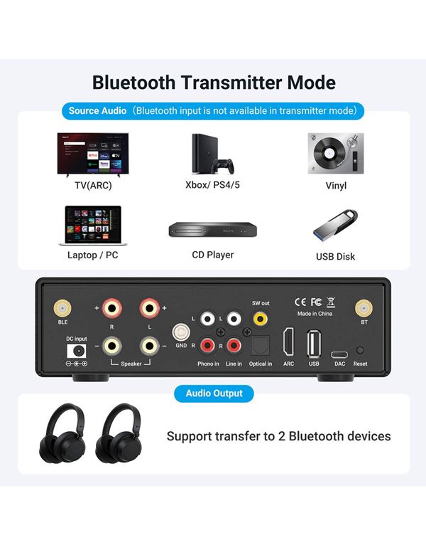Με 50W ανά κανάλι, προσφέρει πλούσιο και εντυπωσιακό ήχο σε σαλόνι, κουζίνα, εργαστήριο ή οποιοδήποτε άλλο δωμάτιο. Στη λειτουργία πομπού, μπορεί να στείλει ήχο σε Bluetooth ακουστικά ή ηχεία, ενώ η τεχνολογία dual-link επιτρέπει ταυτόχρονη σύνδεση σε δύο συσκευές για κοινή ακρόαση με φίλους και οικογένεια.