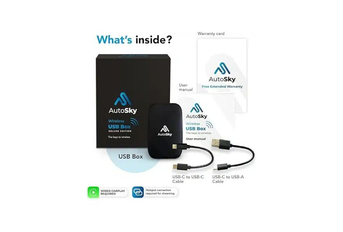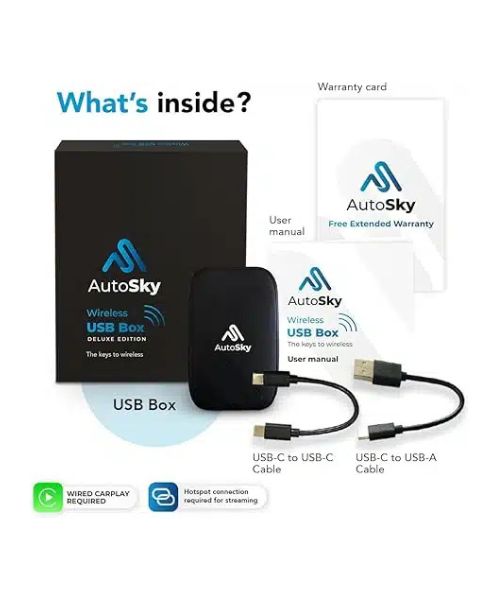 Το AutoSky AI Box Lite μετατρέπει το ενσύρματο CarPlay ή το Android Auto σε ασύρματη εμπειρία. Μπορείτε επίσης να χρησιμοποιήσετε εφαρμογές όπως το Netflix και το YouTube μέσω ενός κινητού hotspot. Ιδανικό για αυτοκίνητα με το αρχικό CarPlay από το 2016 και μετά.Πλεονεκτήματα:Ασύρματο CarPlay & Android Auto. Χωρίς προβλήματα με τα καλώδια στο αυτοκίνητο.Μεταδώστε εφαρμογές βίντεο μέσω ροής. Χρησιμοποιήστε το Netflix και το YouTube κατά τη στάθμευση.Εύκολη εγκατάσταση. Plug & Play μέσω της θύρας USB του αυτοκινήτου σας.Συμβατό με iOS και Android. Λειτουργεί με iPhone 6 ή νεότερη έκδοση και Android 11+.Υποστήριξη κάρτας SD. Αναπαραγωγή τοπικής μουσικής ή βίντεο.Περιεχόμενα συσκευασίας:AutoSky AI Box LiteΚαλώδιο USB-A σε USB-CΚαλώδιο USB-C σε USB-CΕγχειρίδιο χρήστηΠροδιαγραφές:Τύπος: Ασύρματος προσαρμογέας CarPlay & Android AutoΣυμβατότητα: iPhone 6 ή νεότερη έκδοση, Android 11+Συνδεσιμότητα: Wi-Fi, BluetoothΕφαρμογές: Netflix, YouTube (μέσω κινητού hotspot)Υποστήριξη κάρτας SDΕγκατάσταση: Plug & Play μέσω USB