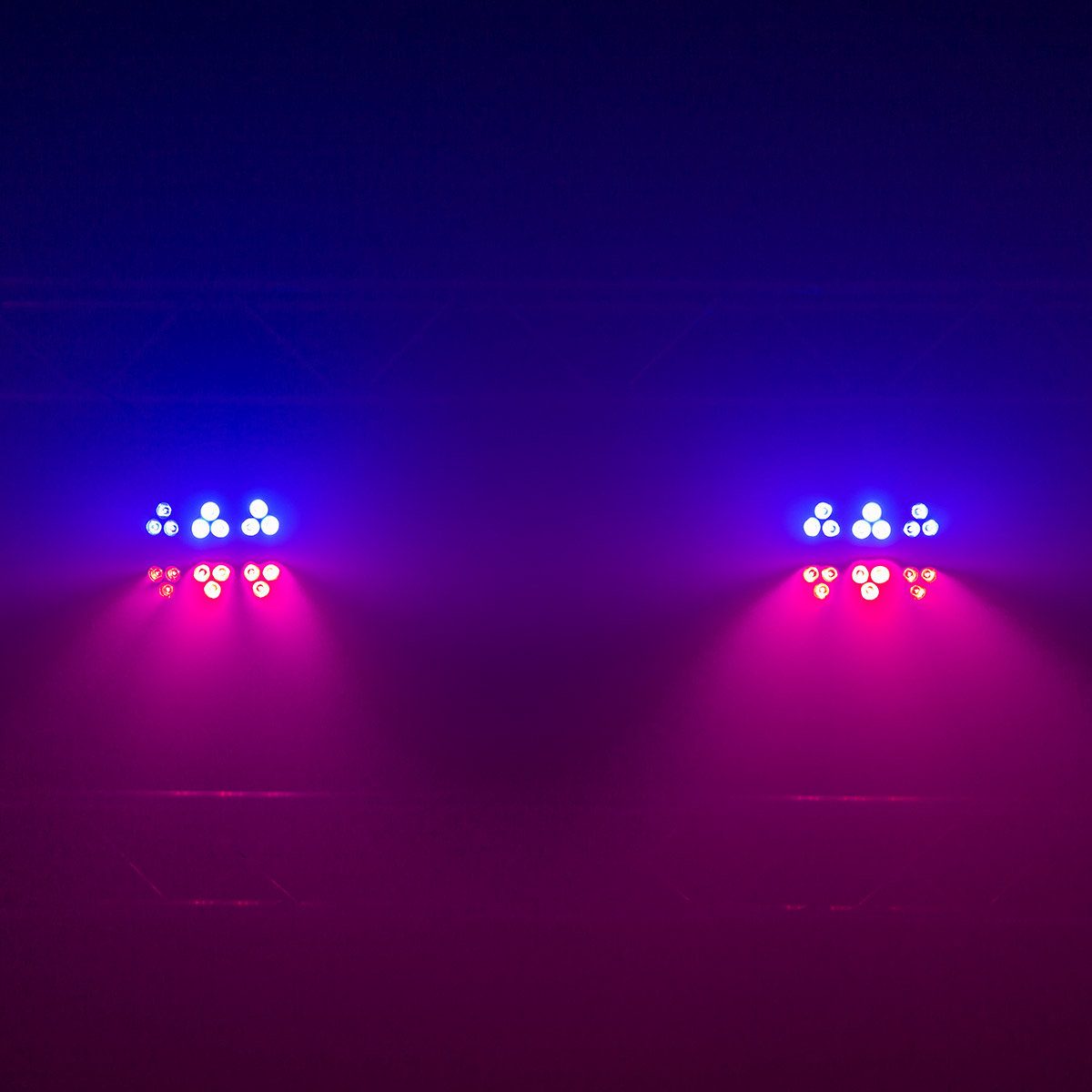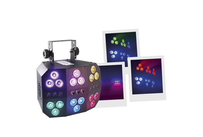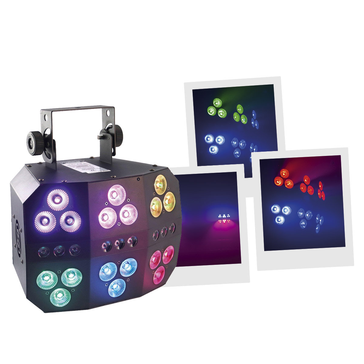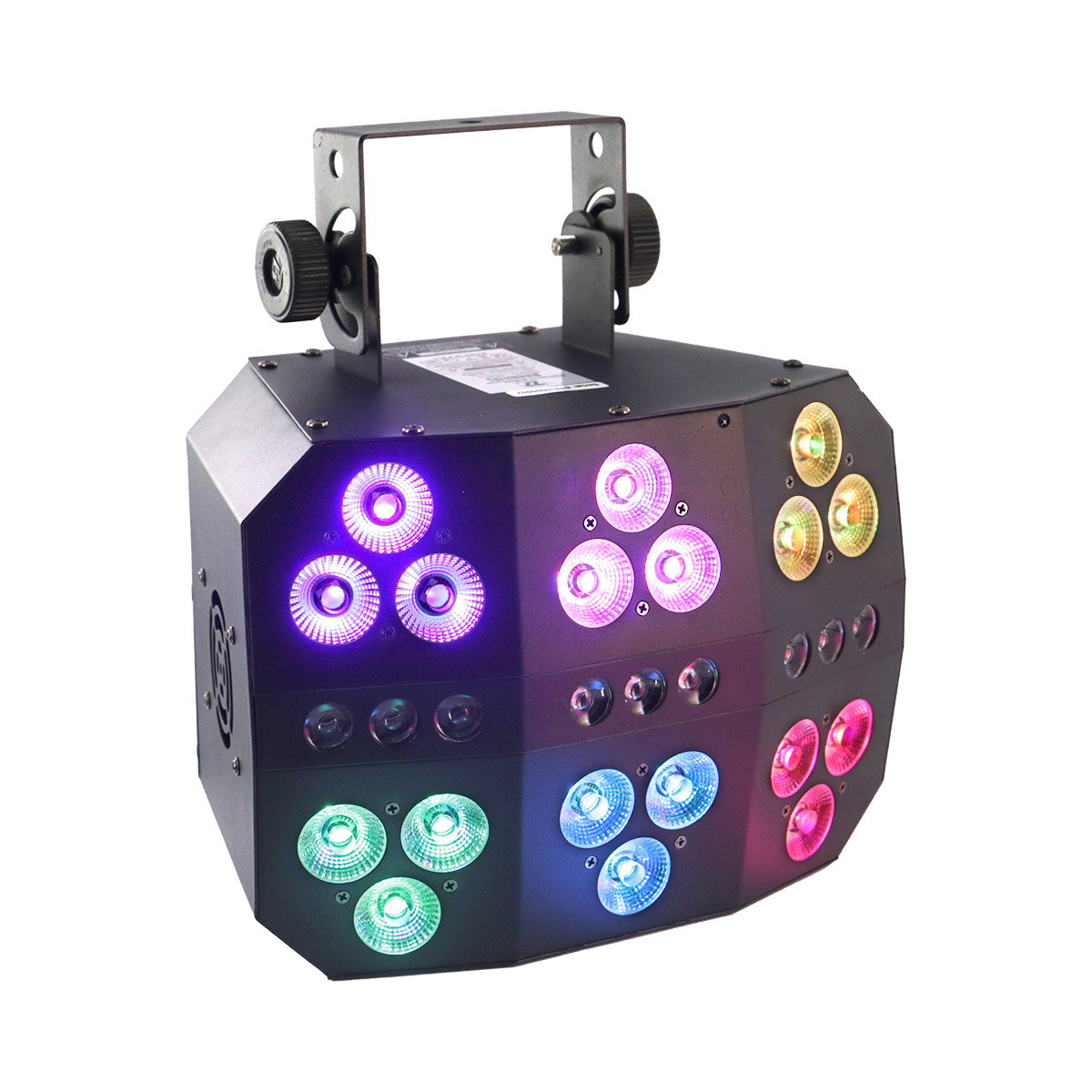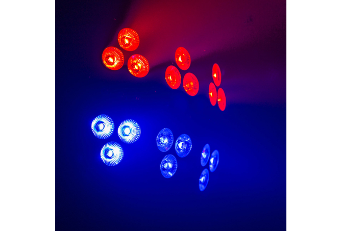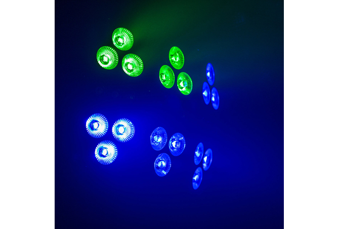 Το BoomTone DJ 9 Pack LED PAR συνδυάζει ένα σετ 6 ζωνών RGBW+UV LED (κόκκινο, πράσινο, μπλε, λευκό + υπεριώδες) και 3 x 3 λευκά LED 1W για την δημιουργία φωτεινών σόου wash και strobe.
