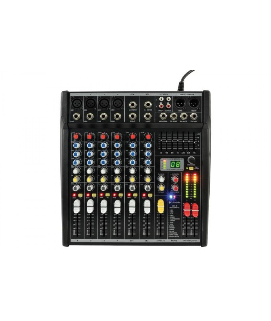 Συμπαγής κονσόλα μίξης με ισορροπημένες εισόδους mic / line και 2 στερεοφωνικές εισόδους. Όλες διαθέτουν EQ 3 περιοχών και aux send. Ένα τμήμα DSP με 16 προγράμματα με tempo παρέχει φωνητικά εφέ ενώ το ενσωματωμένο 7-band graphic EQ εξασφαλίζει τη ρύθμιση του τόνου. Σχεδιασμένη κυρίως για εφαρμογές υψηλών απαιτήσεων, προσφέρει μια συμπαγή και ολοκληρωμένη λύση για φορητά PA, μπαρ και ειδικές εκδηλώσεις.