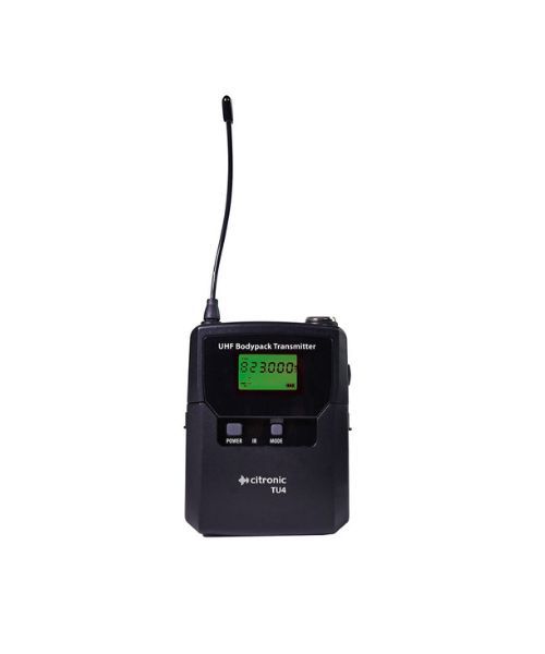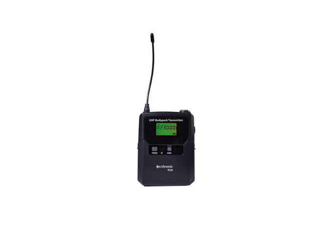 Ανταλλακτικός πομπός ζώνης για το ασύρματο σύστημα UHF Citronic TU4.Προγραμματιζόμενος από τον δέκτη TU4 μέσω συγχρονισμού I.R.Δυνατότητα χρήσης έως 4 πομπών με τον δέκτη TU4 ταυτόχρονα.Συμβατός με μικρόφωνα κεφαλής (neckband) και πέτου (lavalier) της Citronic με σύνδεση Mini XLR.