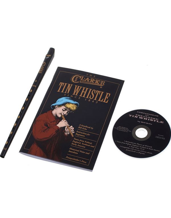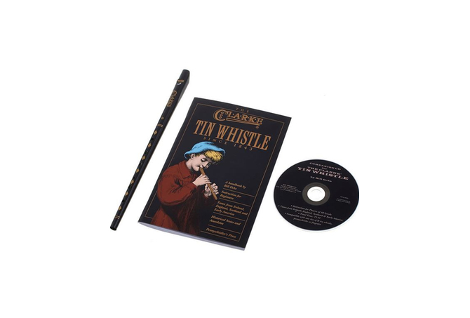 Φλογέρα Tinwhistle με μεταλλικό σώμα και ξύλινο επιστόμιο, σε μαύρο χρώμα. Σετ εκμάθησης το οποίο περιλαμβάνει βιβλίο και CD (στα αγγλικά) για τον τρόπο παιξίματος και ρεπερτόριο παραδοσιακών κομματιών από Ιρλανδία, Αγγλία, Σκωτία κ.α.