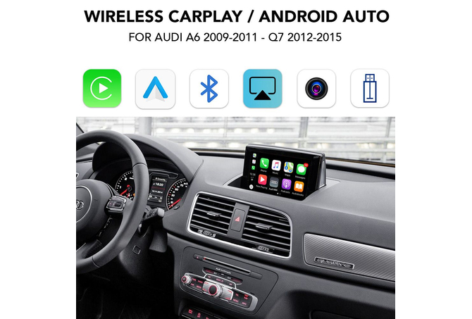 Interface για ασύρματο Apple Car Play, Android Auto, Screen Mirrorink, Bluetooth, USB Player & Κάμερα κατάλληλο για Audi A6 & Q7, διατηρώντας όλες τις εργοστασιακές ενδείξεις του ηχοσυστήματος στην οθόνη του αυτοκινήτου με πλήρη ενσωμάτωση των εργοστασιακών χειριστήριων του αυτοκινήτου.