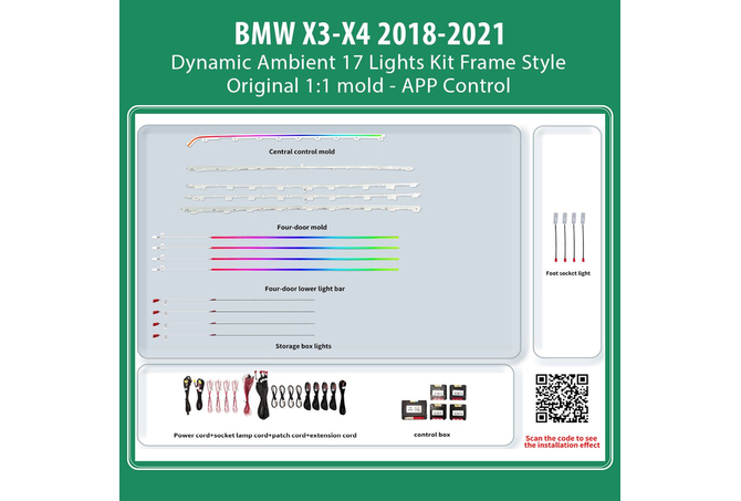 Standard 17pcs lamps (4 door trim strip upper light strips, 4 door trim strip lower light strips, 4 door storage box lights, 4 footwell lights, 1 center console passenger seat light).