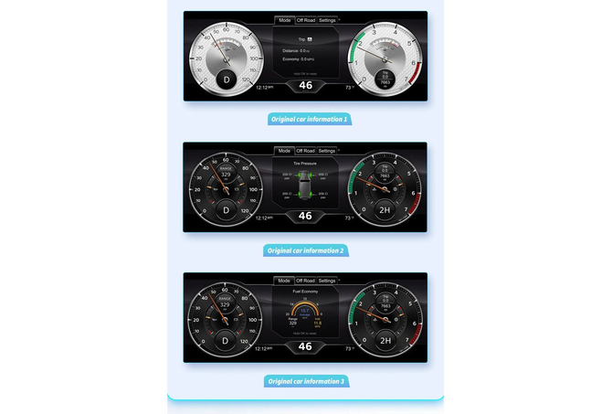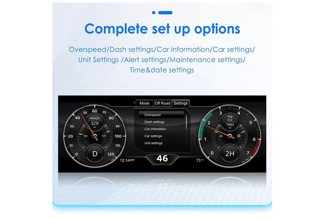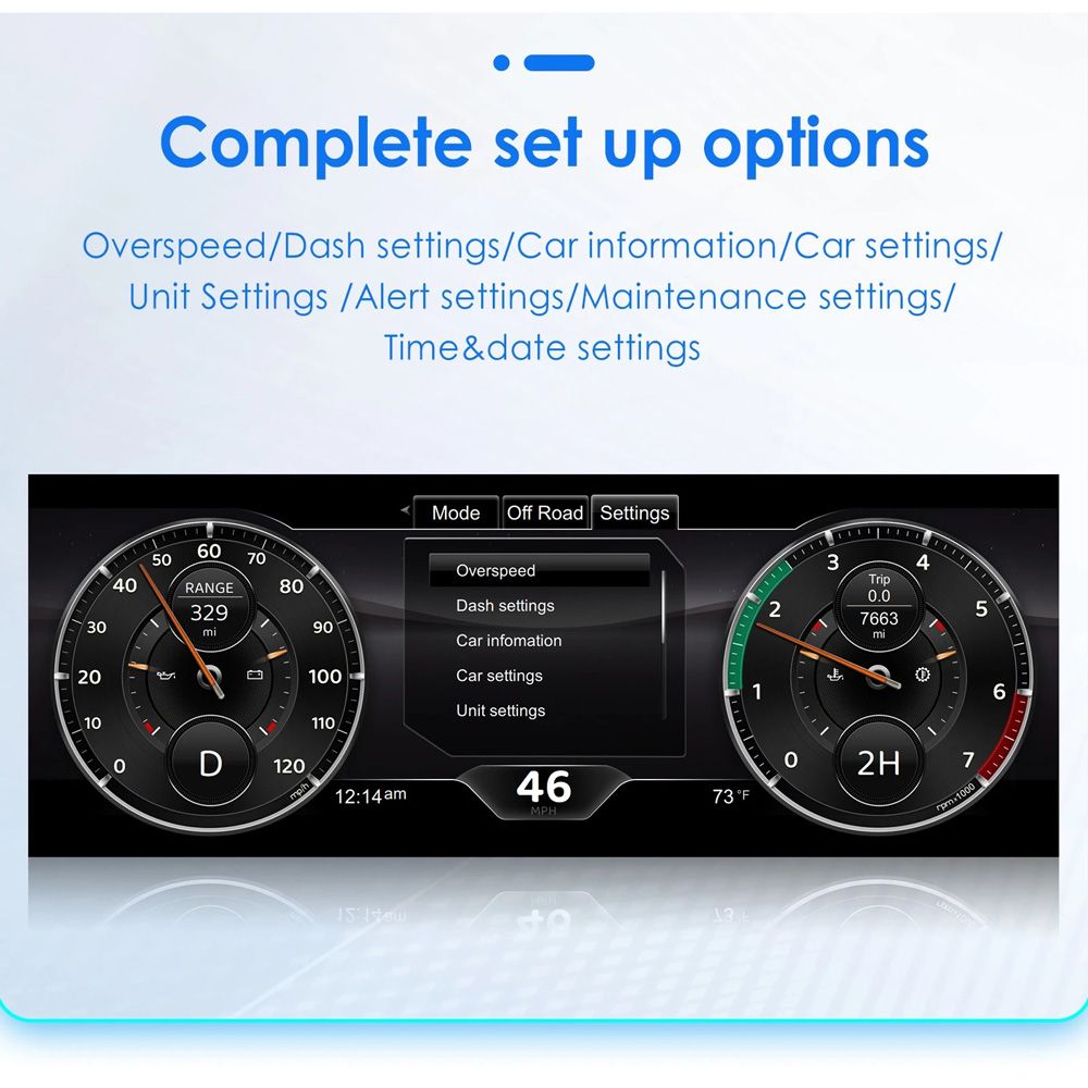 - Support orginal information: Overspeed, Dash settings, Car information, Car settings, Unit Settings, Alert settings, Maintenance settingws, Time&date settings, etc