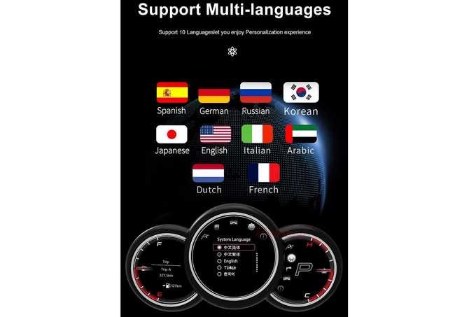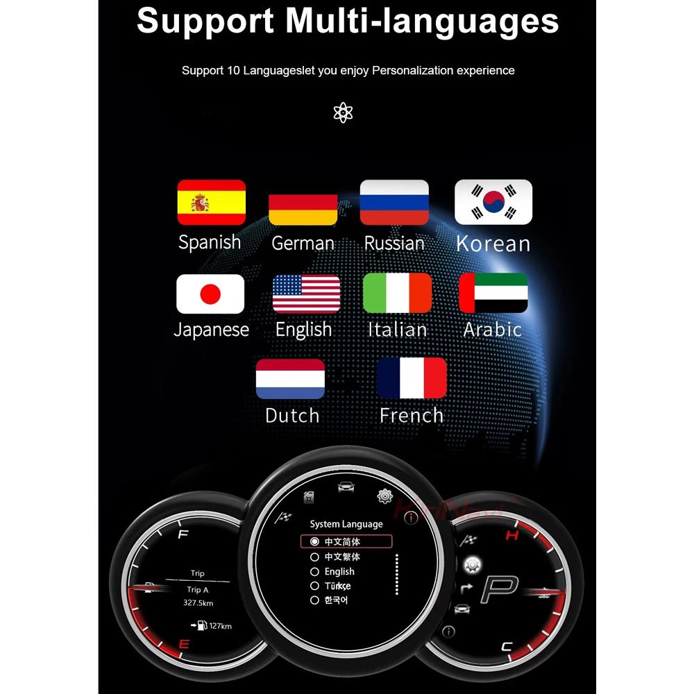 - Support orginal information, such as Miles, Km, Tyre Presure, Oil, water tempreture, oil pressure, fuel consumption, car body balance etc