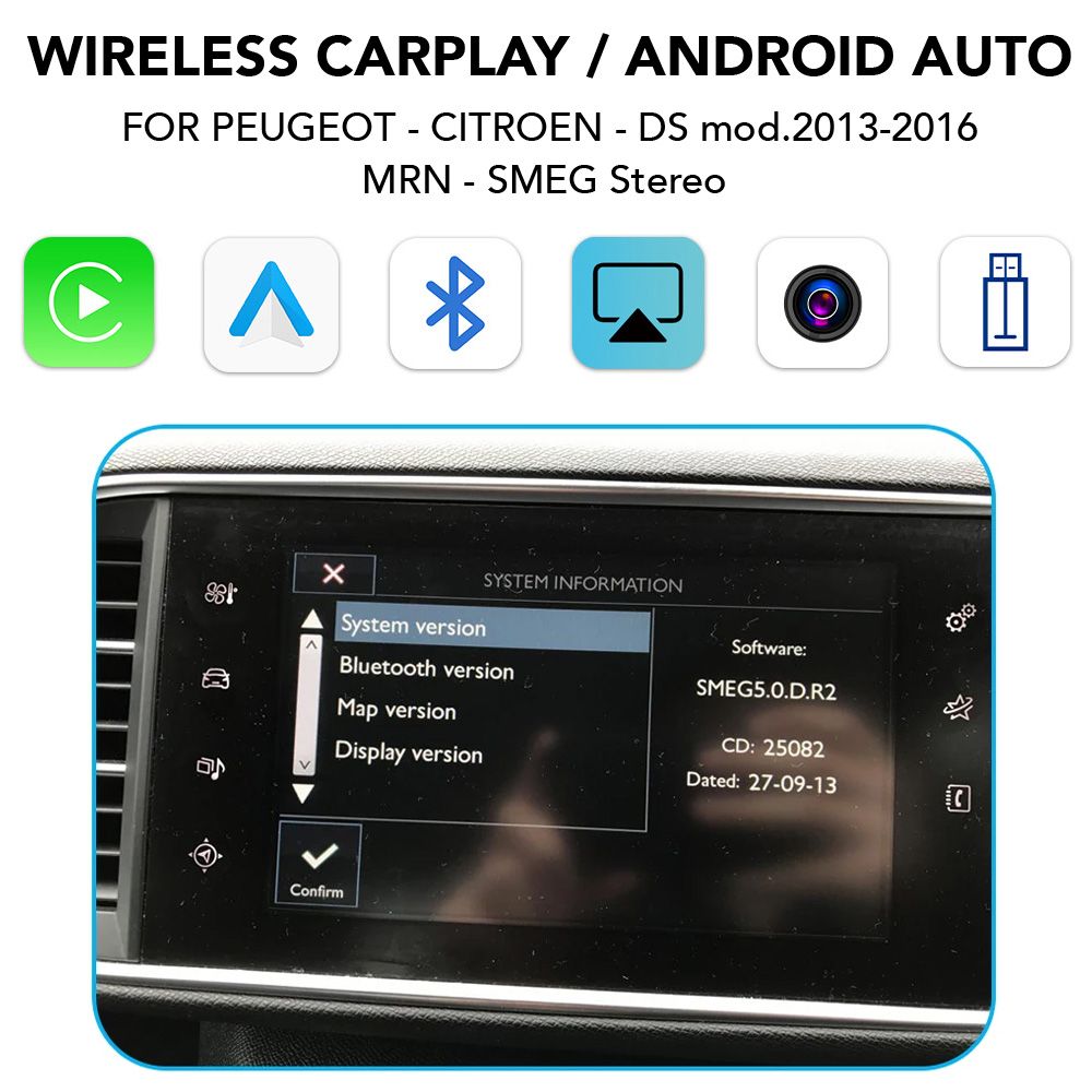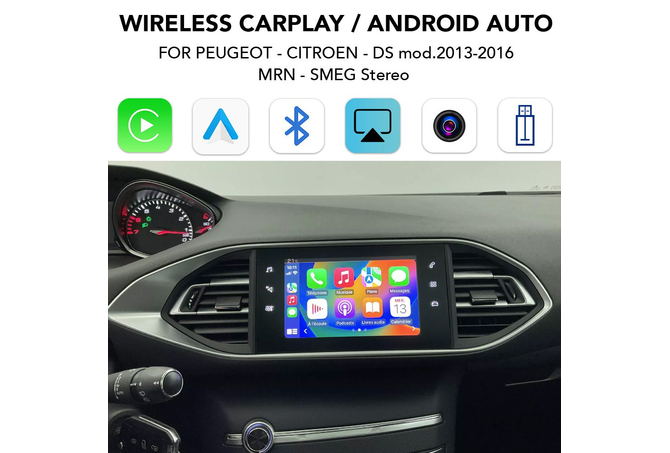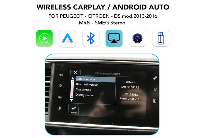 Συμβατό με MRN - SMEG Stereo με Software: SMEG5.0.D.R2 και οθόνη 7", για αυτοκίνητα Peugeot - Citroen - DS 2013-2016, διατηρώντας όλες τις εργοστασιακές ενδείξεις του ηχοσυστήματος στην οθόνη του αυτοκινήτου με πλήρη ενσωμάτωση των εργοστασιακών χειριστήριων του αυτοκινήτου.