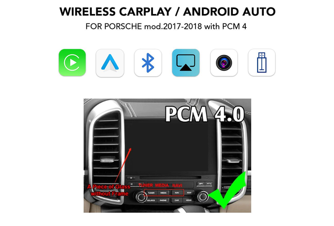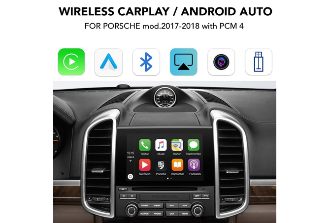 Συμβατό με εργοστασιακό σύστημα PCM 4 και οθόνες  7"-8", για αυτοκίνητα Porsche 2017-2018, διατηρώντας όλες τις εργοστασιακές ενδείξεις του ηχοσυστήματος στην οθόνη του αυτοκινήτου με πλήρη ενσωμάτωση των εργοστασιακών χειριστήριων του αυτοκινήτου.
