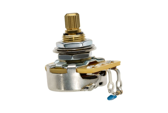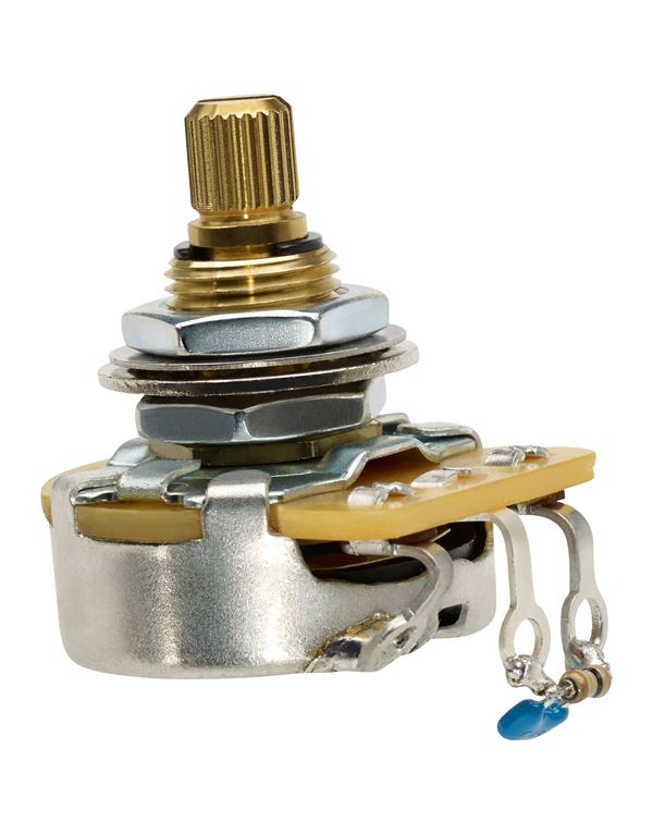 Για τον κιθαρίστα που θέλει να χαμηλώσει την ένταση χωρίς να χάσει τις υψηλές συχνότητες και την παρουσία, τα DiMarzio Custom Taper ποτενσιόμετρα έρχονται προ-καλωδιωμένα με ενσωματωμένο “high-pass” φίλτρο (γνωστό και ως κύκλωμα “treble bleed”). Ο συνδυασμός πυκνωτή 560 pF και αντιστάτη 300 kΩ, συνδεδεμένοι παράλληλα, επιτρέπει στο ποτενσιόμετρο να διατηρεί την αρθρώτητα, την επίθεση και τα πρίμα, ακόμη και σε εξαιρετικά χαμηλά επίπεδα έντασης. Ιδανικό για humbuckers ή single-coils, το DiMarzio Custom Taper pot προσφέρει στον κιθαρίστα πλήρη έλεγχο στις χαμηλές περιοχές έντασης και gain, χωρίς να θυσιάζει την εκφραστικότητα ή την ηχητική ποιότητα.