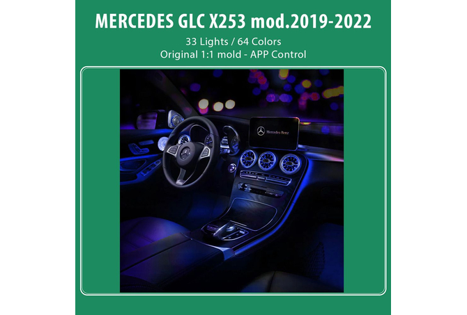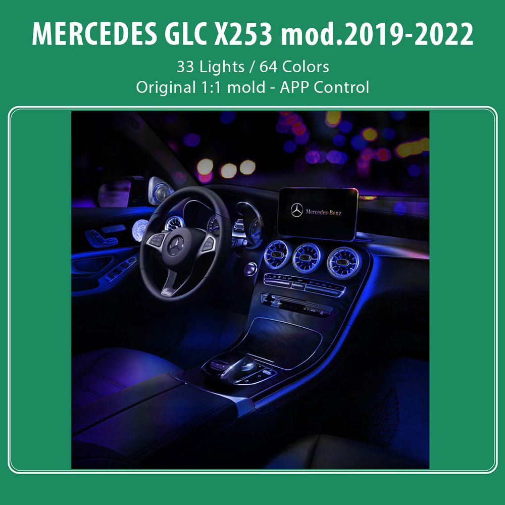 33 Light Sources (7 front and rear air vents, 4 backrest lights, 2 footwells, 4 center saddle lights, 1 center water cup light, 1 center storage box light, 4 door panel contours, 4 pull handles, 2 tweeters, 4 midrange cover lights)