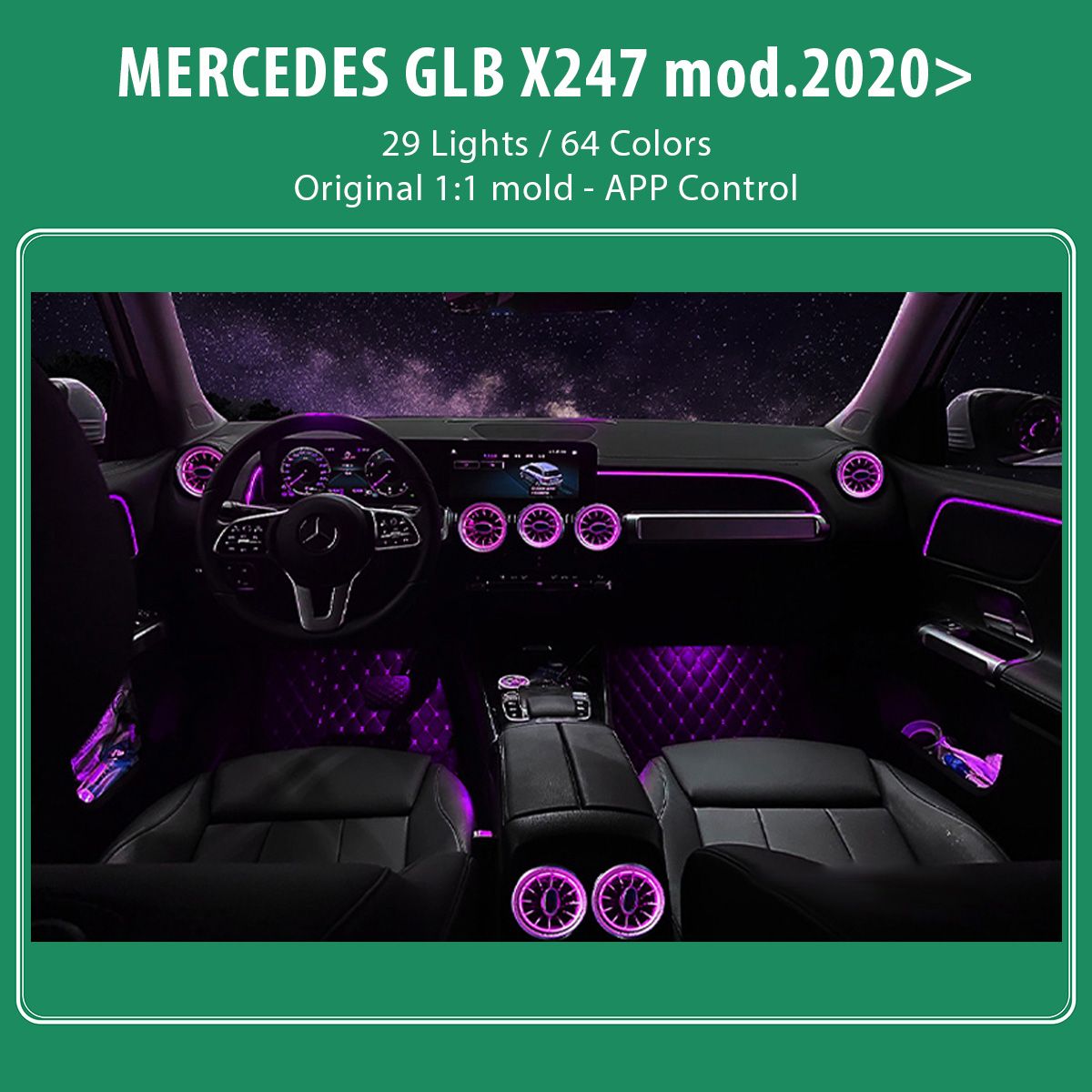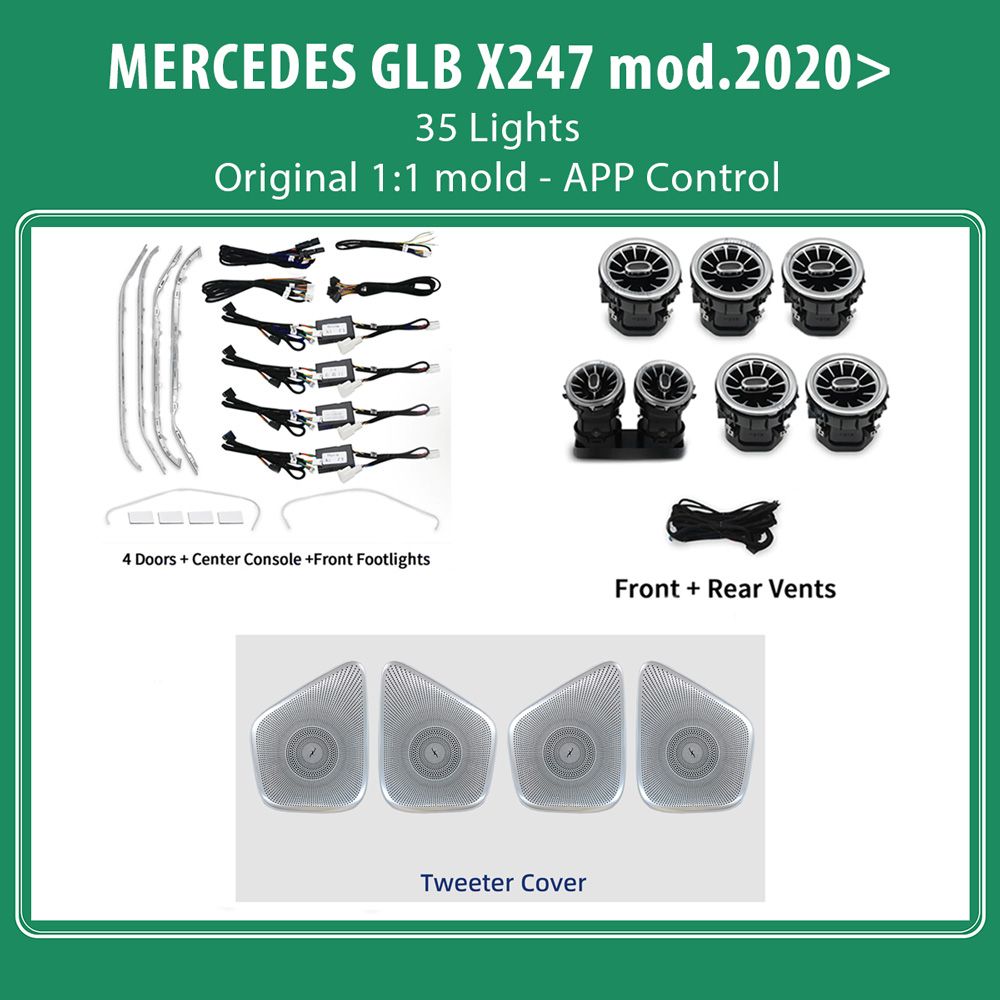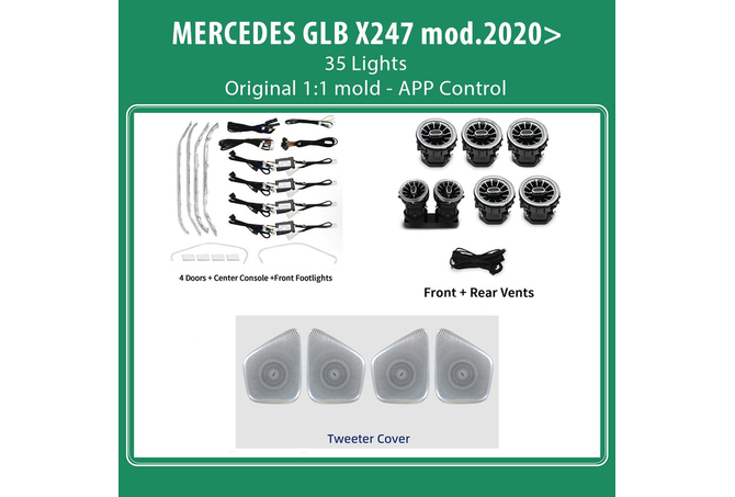 35 light sources (front/rear footwell 4 lights, saddle 4 lights, center cup holder 1 light, center armrest box 1 light, gauges 2 lights, four door pulls 4 lights, four door storage pockets 4 lights, front left/right door profile 2 lights, turbo vents 5 lights, backrests 4 lights, cover 4 lights).