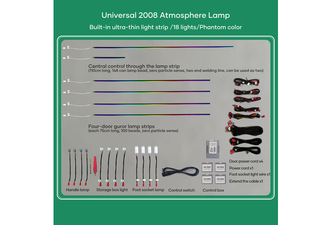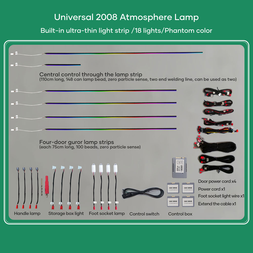Standard 18pcs lights (4pcs door handle lights, 4pcs door outline lights, 4pcs door storage box lights, 4pcs footwell lights, 2pcs central control lights)