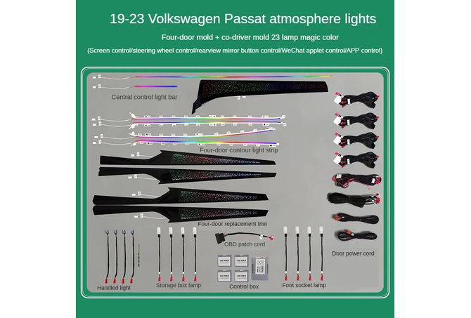 Full Ambient Light Kit 23 lighting options + 4 Door molds lights (4 door handle lights, 4 door contour lights, 4 door surface lights, 4 door storage box lights, 4 footwell lights, 1 on the left side of the steering wheel, 1 below the screen, and 1 front passenger dragon scale decorative panel)