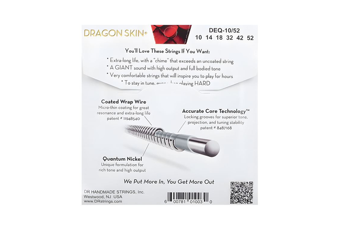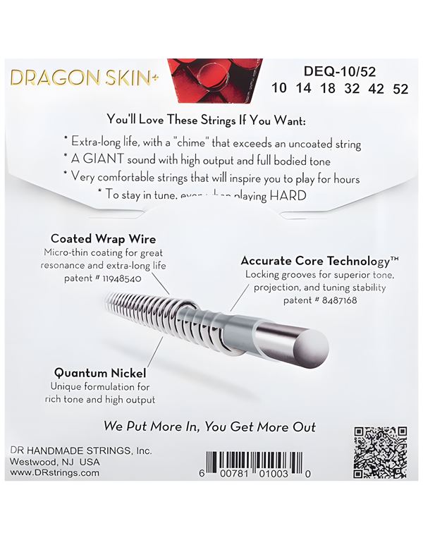 Οι χορδές Dragon Skin+™ έχουν τεράστιο ήχο , παίζονται εύκολα και έχουν εξαιρετική αντοχή. Το Dragon Skin+ αναβαθμίζει τόσο τον πυρήνα όσο και την περιέλιξη για να έχουν εξαιρετικά μουσικό, ισορροπημένο και δυνατό αποτέλεσμα. Το Accurate Core Technology™ δημιουργεί αυλακώσεις στον πυρήνα για τη βάση του σύρματος περιτύλιξης, επιτρέποντας στις χορδές να ηχούν στο μέγιστο των δυνατοτήτων τους.