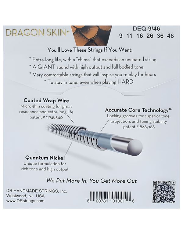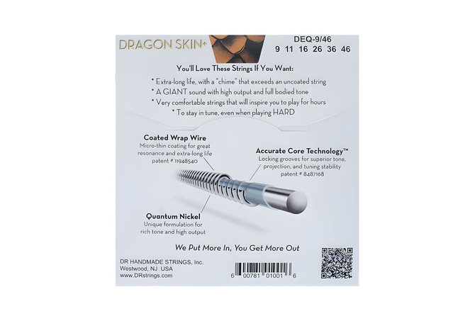 Οι χορδές Dragon Skin+™ έχουν τεράστιο ήχο , παίζονται εύκολα και έχουν εξαιρετική αντοχή. Το Dragon Skin+ αναβαθμίζει τόσο τον πυρήνα όσο και την περιέλιξη για να έχουν εξαιρετικά μουσικό, ισορροπημένο και δυνατό αποτέλεσμα. Το Accurate Core Technology™ δημιουργεί αυλακώσεις στον πυρήνα για τη βάση του σύρματος περιτύλιξης, επιτρέποντας στις χορδές να ηχούν στο μέγιστο των δυνατοτήτων τους.
