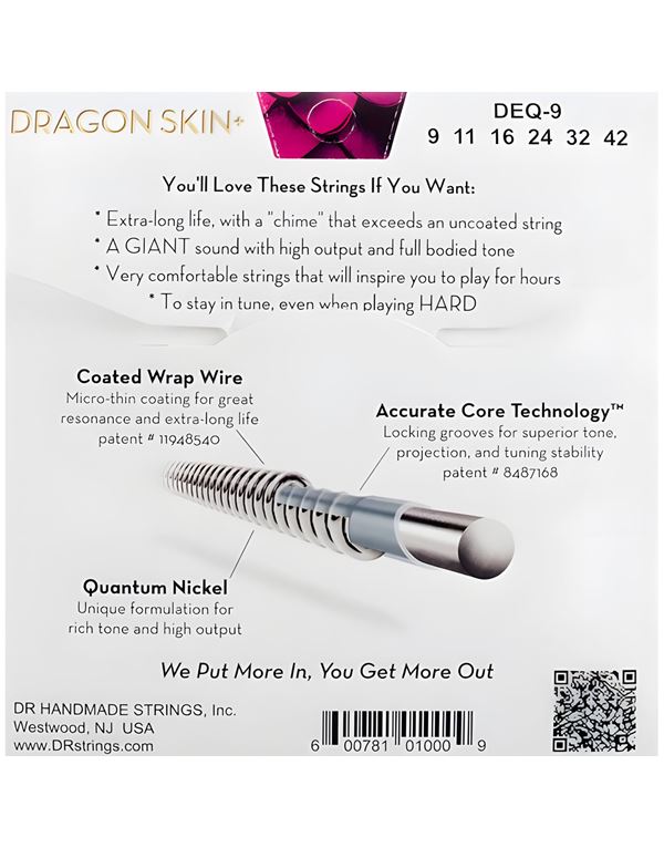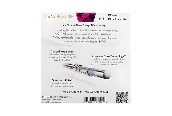 Οι χορδές Dragon Skin+™ έχουν τεράστιο ήχο , παίζονται εύκολα και έχουν εξαιρετική αντοχή. Το Dragon Skin+ αναβαθμίζει τόσο τον πυρήνα όσο και την περιέλιξη για να έχουν εξαιρετικά μουσικό, ισορροπημένο και δυνατό αποτέλεσμα. Το Accurate Core Technology™ δημιουργεί αυλακώσεις στον πυρήνα για τη βάση του σύρματος περιτύλιξης, επιτρέποντας στις χορδές να ηχούν στο μέγιστο των δυνατοτήτων τους.