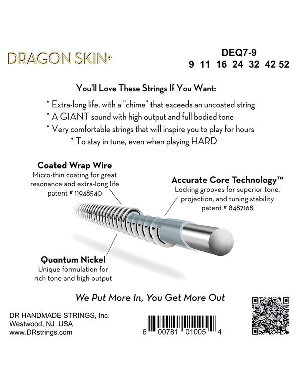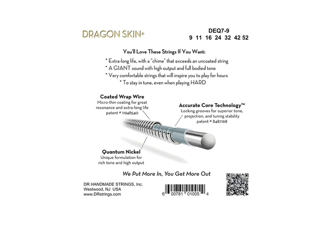 Οι χορδές Dragon Skin+™ έχουν τεράστιο ήχο , παίζονται εύκολα και έχουν εξαιρετική αντοχή. Το Dragon Skin+ αναβαθμίζει τόσο τον πυρήνα όσο και την περιέλιξη για να έχουν εξαιρετικά μουσικό, ισορροπημένο και δυνατό αποτέλεσμα. Το Accurate Core Technology™ δημιουργεί αυλακώσεις στον πυρήνα για τη βάση του σύρματος περιτύλιξης, επιτρέποντας στις χορδές να ηχούν στο μέγιστο των δυνατοτήτων τους.
