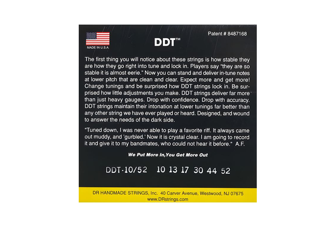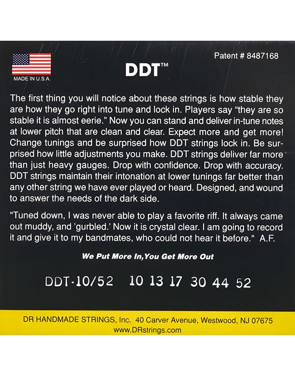 Οι χορδές ηλεκτρικής κιθάρας DDT™ διατηρούν τον τόνο τους ακόμα και στα χαμηλότερα κουρδίσματα χάρη στην τεχνολογία Coated Core Technology™ (CCT™) της DR. O επικαλυμμένος εξαγωνικός πυρήνας κλειδώνει την επινικελωμένη ατσάλινη περιέλιξη στη θέση της για να αυξήσει τη σταθερότητα σε οποιαδήποτε τάση. Τώρα μπορείτε να έχετε νότες σε χαμηλότερο pitch που είναι καθαρές και in tune. Αλλάξτε κουρδίσματα και θα εκπλαγείτε με το πόσο εύκολα οι χορδές DDT κλειδώνουν και παραμένουν εκεί θέλετε τονικά .