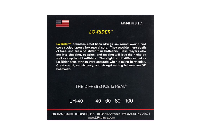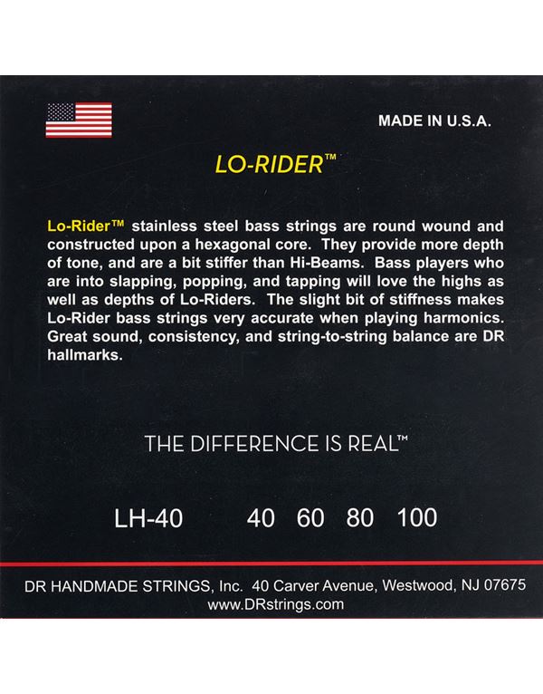 Οι χορδές μπάσου LO-RIDER™ είναι για μουσικούς που τους αρέσει το slapping, το popping και το tapping. Με περιέλιξη από ανοξείδωτο ατσάλι σε εξαγωνικό πυρήνα, προσφέρουν έναν συνδυασμό υψηλών συχνοτήτων, βάθους και λίγης ακαμψίας που καθιστά τις αρμονικές πολύ ακριβείς. Η εξαιρετική συνέπεια και η ανώτερη ισορροπία μεταξύ χορδών είναι χαρακτηριστικά όλων των χορδών DR, αλλά οι χορδές LO-RIDER™ παρέχουν μεγαλύτερο βάθος τόνου και είναι λίγο πιο άκαμπτες από τις HI-BEAMS™.