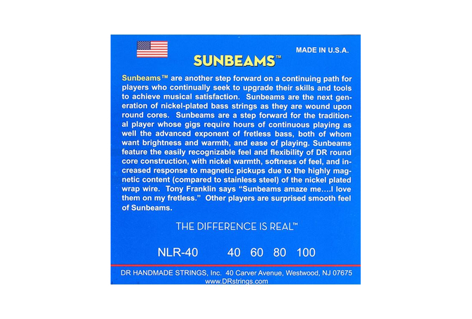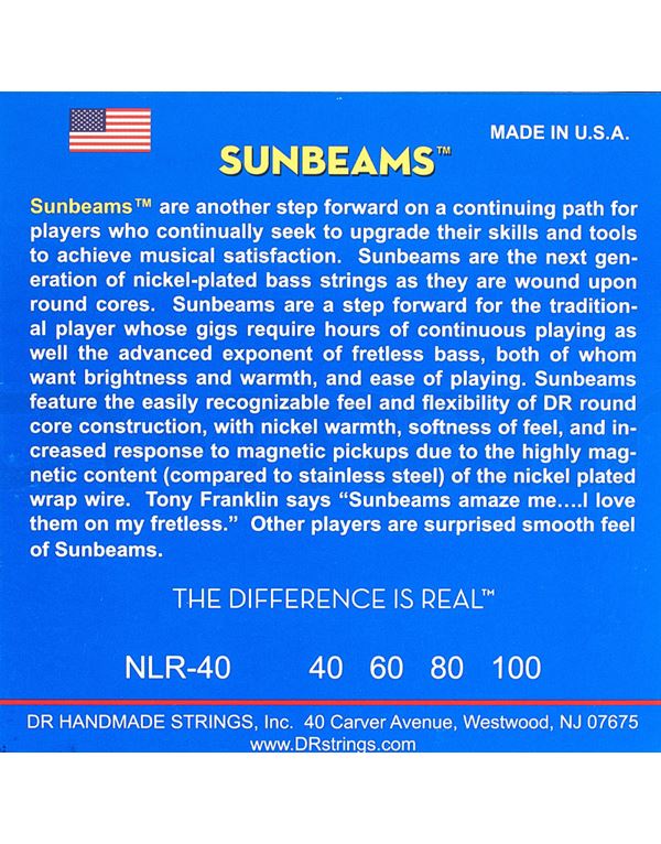 Οι SUNBEAMS™ αποτελούν ένα ακόμη βήμα σε μια συνεχή πορεία για τους μουσικούς που επιδιώκουν συνεχώς να αναβαθμίζουν τις δεξιότητες και τα εργαλεία τους για να επιτύχουν μουσικά . Οι SUNBEAMS™ είναι η επόμενη γενιά χορδών μπάσου με επινικελωμένη περιέλιξη, καθώς κουρδίζονται σε στρογγυλούς πυρήνες. Οι Sunbeams είναι μια προταση εκπρόσωπο του άταστου, που επιθυμούν brightness και ηχητική ζεστασιά. Οι Sunbeams διαθέτουν την αναγνωρίσιμη αίσθηση και ευελιξία της κατασκευής με στρογγυλό πυρήνα DR, με ζεστασιά από Nickel-Plated Steel υλικό, απαλή αίσθηση και αυξημένη απόκριση στους μαγνήτες λόγω του (magnetic) περιεχομένου (σε σύγκριση με το ανοξείδωτο ατσάλι) του επινικελωμένου περιέλιξης.