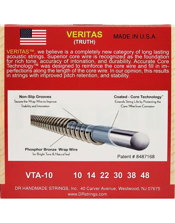 Οι χορδές ακουστικής κιθάρας VERITAS™ διατηρούν τον τόνο τους, τη σταθερότητα του κουρδίσματος και το intonation χάρη στην τεχνολογία Coated Core Technology™, μια διαδικασία επικάλυψης του στρογγυλού πυρήνα, η οποία ασφαλίζει την περιέλιξη στη θέση της και παρατείνει τη διάρκεια ζωής της χορδής προστατεύοντας τον πυρήνα από τη διάβρωση. Η περιέλιξη από phosphor bronze προσφέρει έναν παραδοσιακά φωτεινό ήχο και φυσική αίσθηση.