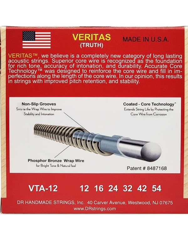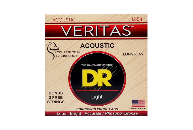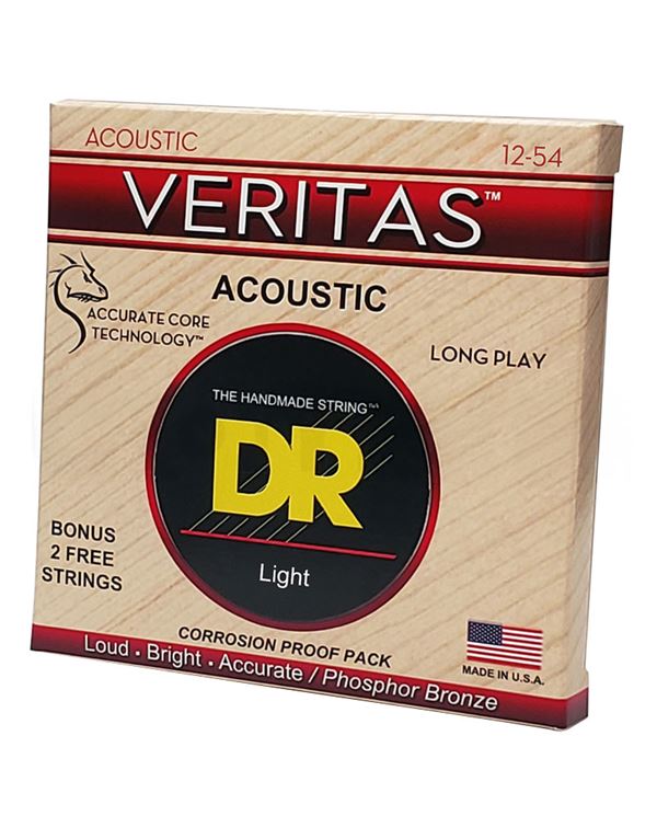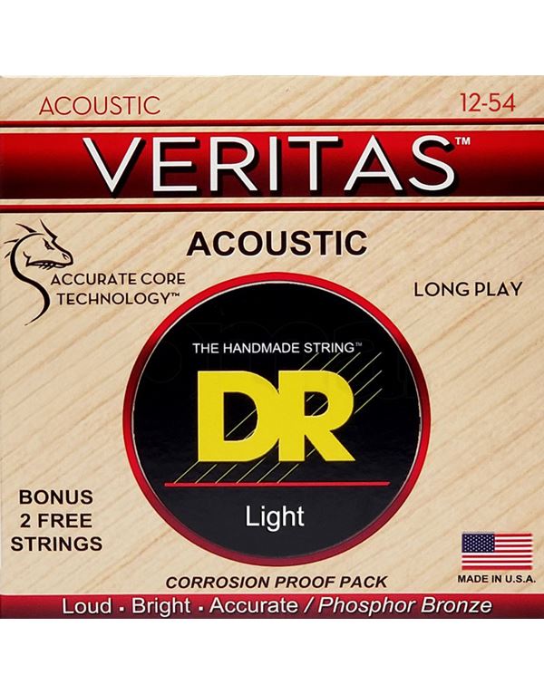 Οι χορδές ακουστικής κιθάρας VERITAS™ διατηρούν τον τόνο τους, τη σταθερότητα του κουρδίσματος και το intonation χάρη στην τεχνολογία Coated Core Technology™, μια διαδικασία επικάλυψης του στρογγυλού πυρήνα, η οποία ασφαλίζει την περιέλιξη στη θέση της και παρατείνει τη διάρκεια ζωής της χορδής προστατεύοντας τον πυρήνα από τη διάβρωση. Η περιέλιξη από phosphor bronze προσφέρει έναν παραδοσιακά φωτεινό ήχο και φυσική αίσθηση.