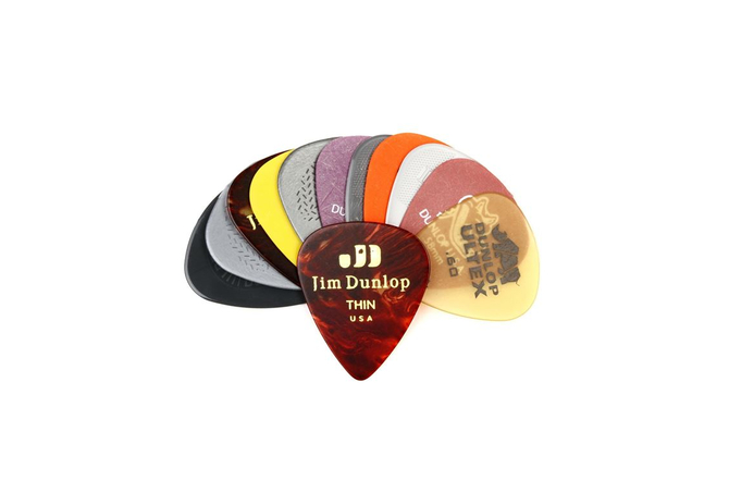 Σετ με 12 πέννες Dunlop πάχους Light και Medium από τις πιο δημοφιλείς σειρές της Dunlop, Nylon Standard, Max-Grip®, Celluloid, Gator Grip®, Tortex®, Ultex® light.