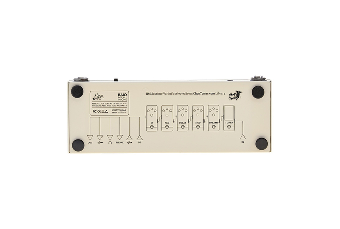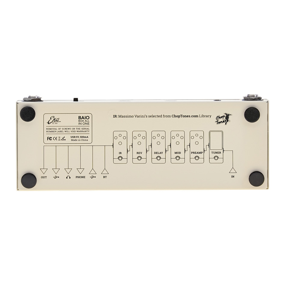 - Το πίσω πλαίσιο διαθέτει 2 τυπικές υποδοχές εισόδου και εξόδου, διακόπτη ON/OFF, θύρα USB για την τροφοδοσία του πεντάλ και τη φόρτιση της μπαταρίας και μια σύνδεση υπολογιστή για χρήση του BAIO ως διεπαφή ήχου.Μέσω της εισόδου τηλεφώνου, μπορείτε να συνδέσετε το smartphone σας στο πεντάλ χρησιμοποιώντας το παρεχόμενο καλώδιο και να χρησιμοποιήσετε το BAIO ως διεπαφή ήχου και στο smartphone σας.