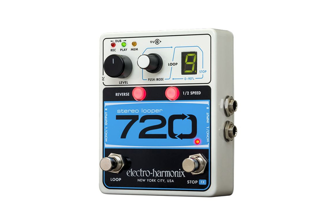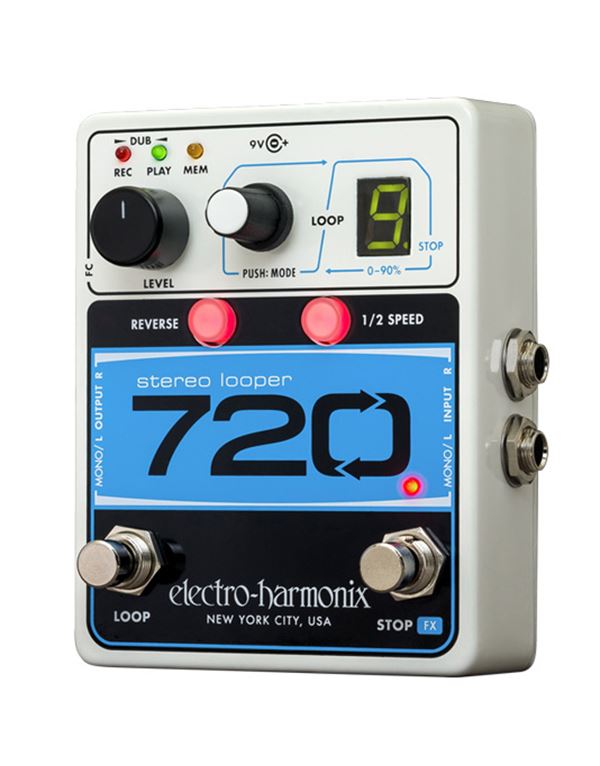 Το EHX 720 Stereo Looper είναι ένα ισχυρό πετάλι looping με 12 λεπτά στερεοφωνικής εγγραφής, 10 τράπεζες μνήμης και λειτουργίες δημιουργικής απόδοσης. Ο απλός στη χρήση σχεδιασμός του το καθιστά εύκολο και αποτελεσματικό στη χρήση τόσο σε καταστάσεις live όσο και σε εξάσκηση. Οι εγγραφές 720 σε στερεοφωνικό υψηλής ποιότητας για χρήση με στερεοφωνικά εφέ ή ακόμη και χρήση με δύο όργανα. Ένας δεύτερος ποδοδιακόπτης μπορεί να προγραμματιστεί ώστε να διακόπτει την αναπαραγωγή ή να ενεργοποιεί/απενεργοποιεί τα ενσωματωμένα εφέ αναπαραγωγής Reverse και 1/2 Speed. Η προγραμματιζόμενη λειτουργία Fadeout εφαρμόζει ένα αυτόματο fade όταν διακόπτεται η αναπαραγωγή.