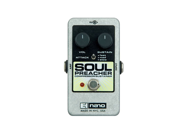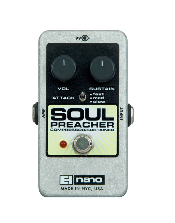 Το EHX Soul Preacher Compressor / Sustainer είναι ένας συμπαγής Compressor / Sustainer με μεταβλητές παραμέτρους που επιτρέπουν ακραίες ή ανεπαίσθητες ρυθμίσεις των δυναμικών ποιοτήτων του παιξίματός σας. Δύο κουμπιά και ένας διακόπτης εναλλαγής 3 κατευθύνσεων ελέγχουν την ένταση του ήχου εξόδου, το βάθος του εφέ και τα χαρακτηριστικά attack/decay του εφέ.
