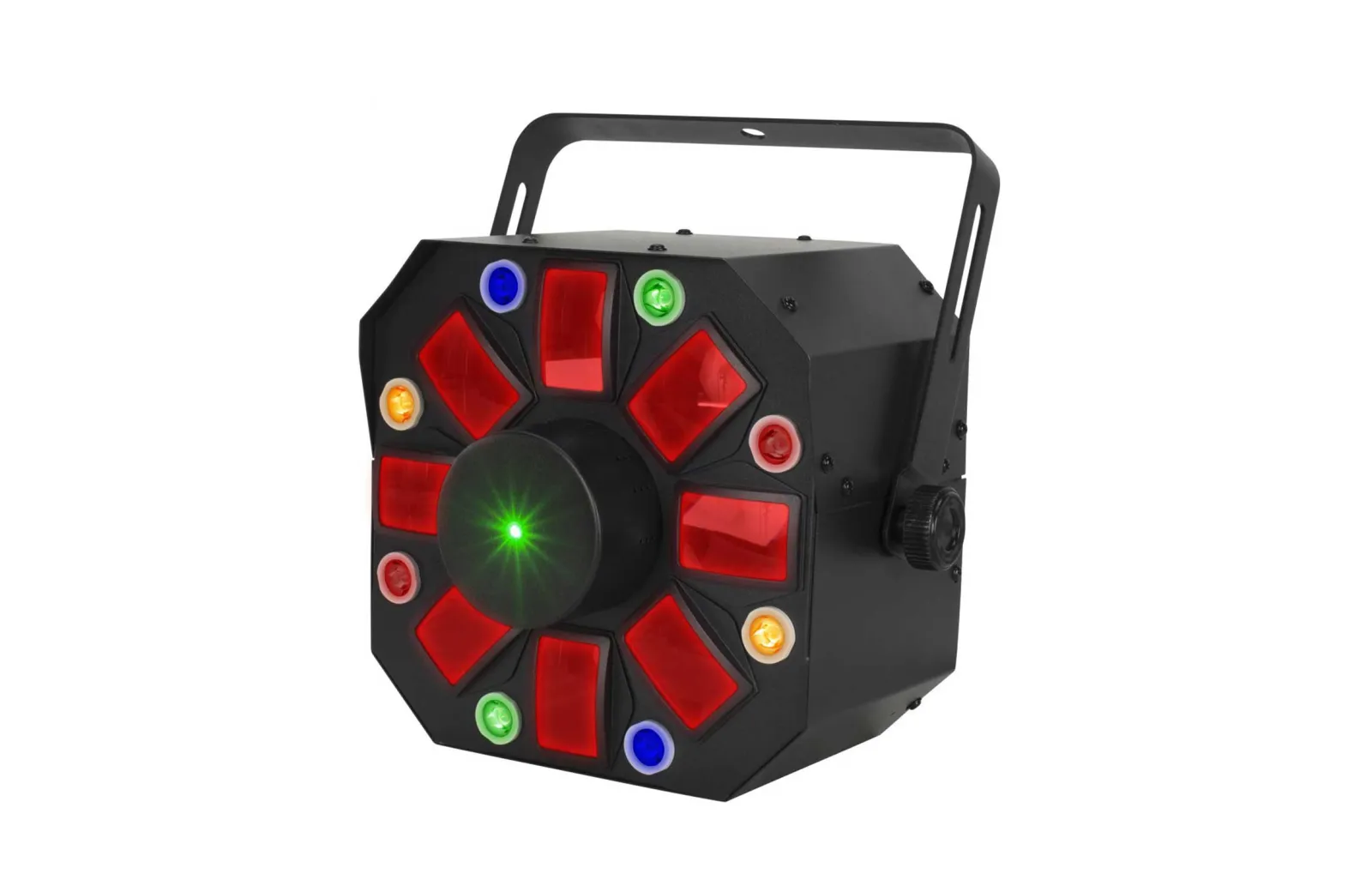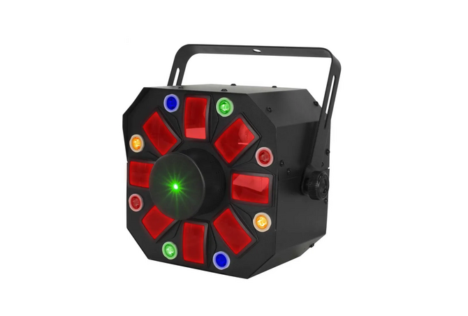ADJ Furious Three RG, σύστημα φωτισμού που περιλαμβάνει 3 διαφορετικά εφέ, Moonflower, Wash και laser. Μικρό σε μέγεθος και βολικό στις συχνές μετακινήσεις, μπορεί να χρησιμοποιηθεί σε εκδηλώσεις, σε μόνιμες εγκαταστάσεις και σε μικρούς χώρους ως μία ολοκληρωμένη λύση