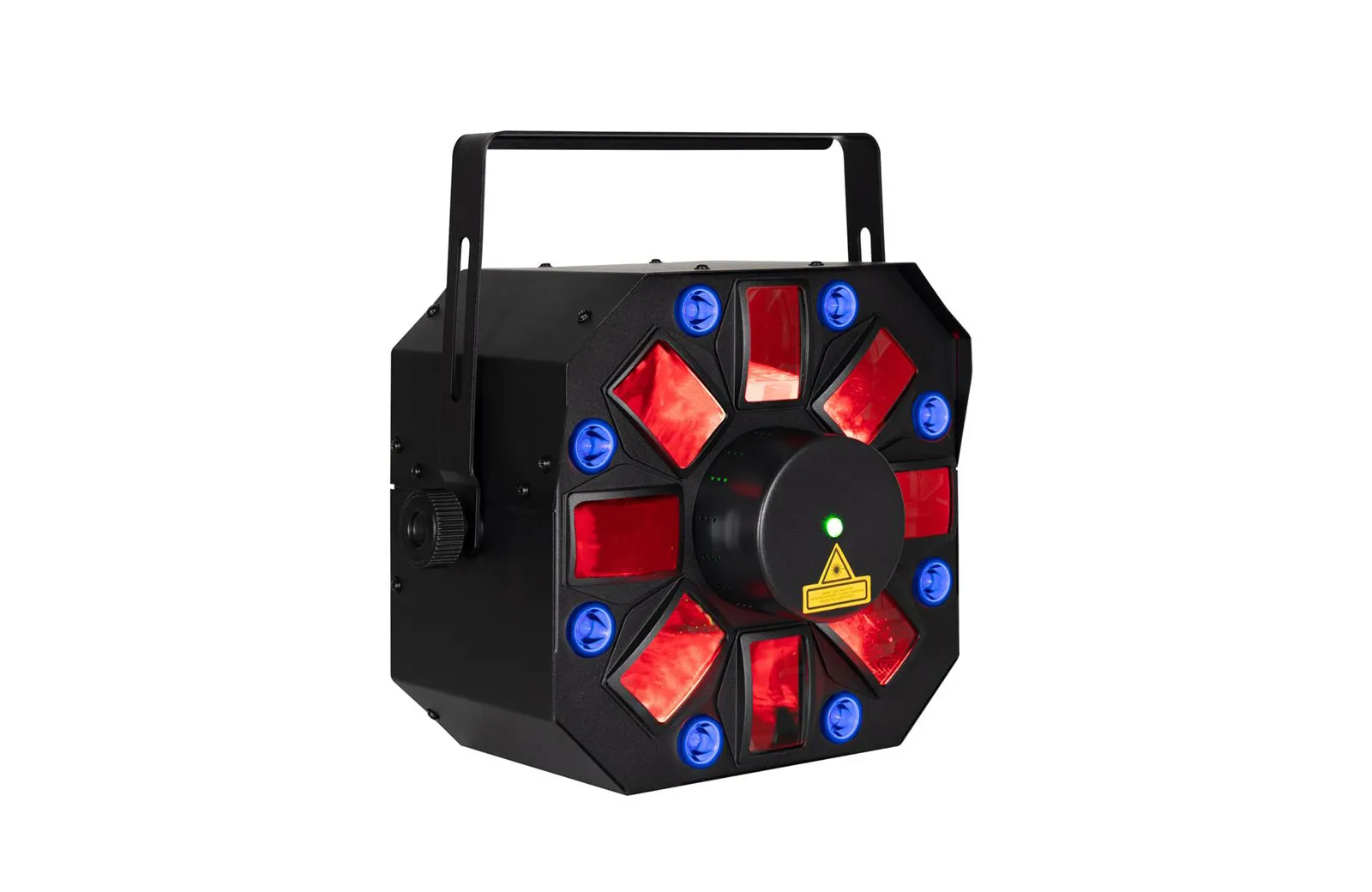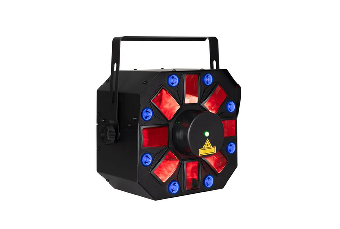 Eliminator Furious Three RG UV, επαγγελματικό 3-σε-1 φωτιστικό εφέ με Moonflower, UV & Laser που διαθέτει πέντε penta-LEDs των 5W, οκτώ UV LEDs των 3W και λέιζερ με κόκκινο και πράσινο χρώμα.