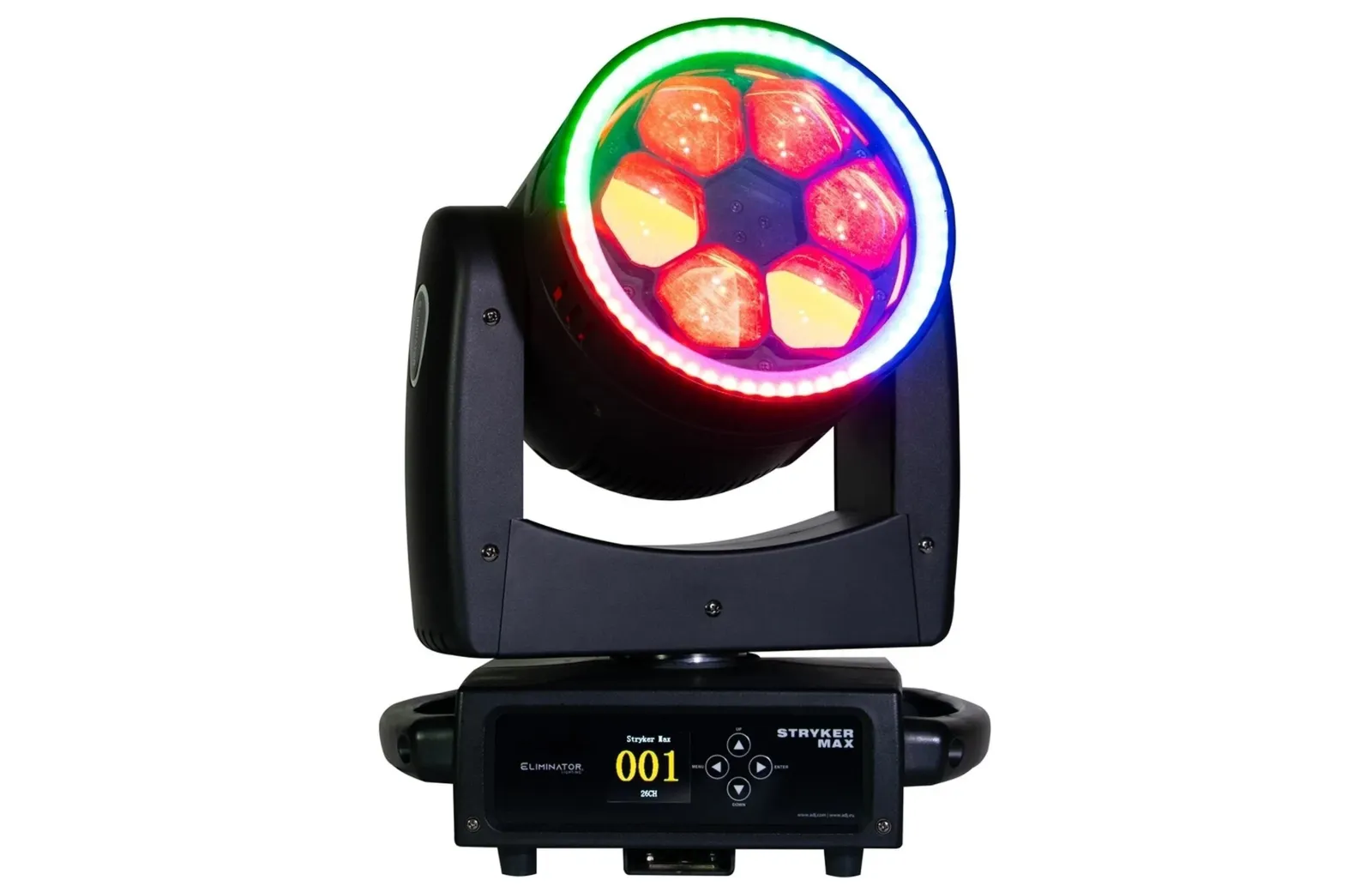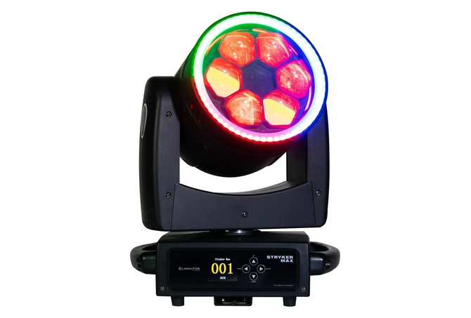 Eliminator Stryker Max, επαγγελματική κινητή κεφαλή φωτισμού Wash-Zoom με 6 RGBW LEDs των 40W το καθένα προσαρμοσμένα πίσω από ένα περιστρεφόμενο φακό. Η κεφαλή επίσης διαθέτει ένα εξωτερικό στεφάνι που περιλαμβάνει 60 RGB LEDs των 0.5W το καθένα για επιπρόσθετο εφέ.