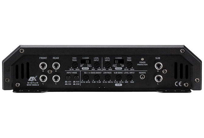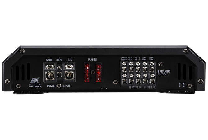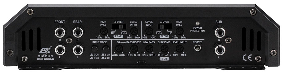 SXE1000.5 5-Channel Class A/B & D Hybrid Amplifier 2000 Watts Max. Output Power Class A/B: 4 x 75/125 Watts RMS @ 4/2 Ohms Highpass Filter 32 Hz – 2000 Hz Class D: 1 x 200/350/500 Watts RMS @ 4/2/1 Ohms Lowpass Filter 32 Hz – 300 Hz Subsonic Filter 10 Hz – 60 Hz Bass Boost 0 – 12 dB @ 40 Hz – 60 Hz RCA Inputs, Bass-Remote Controller Dimensions: 220 x 51 x 360/402 mm Efficiency up to 64% Aluminum Heat sink with Acrylic Inlays and flush-mount Diamond Cut-Logo Aluminum Frames on the end panels Massive Terminals Bottom panel with sturdy Mounting Brackets MOSFET PWM-Power Supply, 3-way Protection Circuit Compact Bass Remote Class A/B & D Hybrid Technology