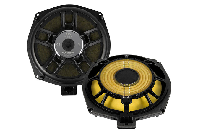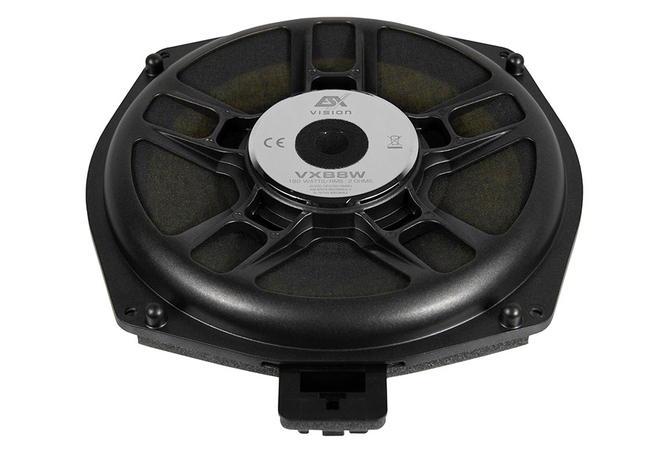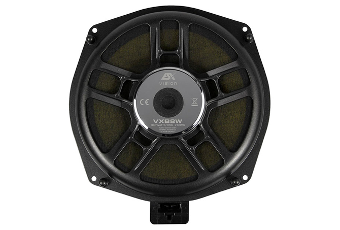 VXB8W 20 cm (8”) Subwoofer (Pair) Power Rating 180/300 Watt RMS/max. Impedance 2 Ohms, Frequency Range 30 – 300 Hz 217 mm Kevlar Composite Cone 51 mm Voice Coil, Nomex Spider N35 Neodymium Magnet Driver Car-specific Connector Installation Depth: 31 mm, Installation Opening : 200 mm Fits into: Many BMW E/F/G and MINI R/F Models Refer to Compatibility List For all BMW or Mini fans with high musical demands, the VISION VXB speaker systems are now available, which leave nothing to be desired. The quality is already evident when unpacking the VISION VXB sets, which are top-quality and equipped with high-quality die-cast aluminum baskets. All components are consistently designed for plug & play. No cables have to be destroyed, no extra hole has to be drilled anywhere and body parts do not have to be additionally processed. All VISION VXB components are perfectly tailored to the vehicle-specific installation locations. In addition to the unbelievably good midrange and high-frequency speakers, the VXB subwoofer duo must be mentioned. They impress with large 51 mm voice coils, a load capacity of 180 watts RMS at 2 Ω and Kevlar composite cones, specially designed for high levels.