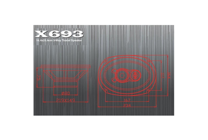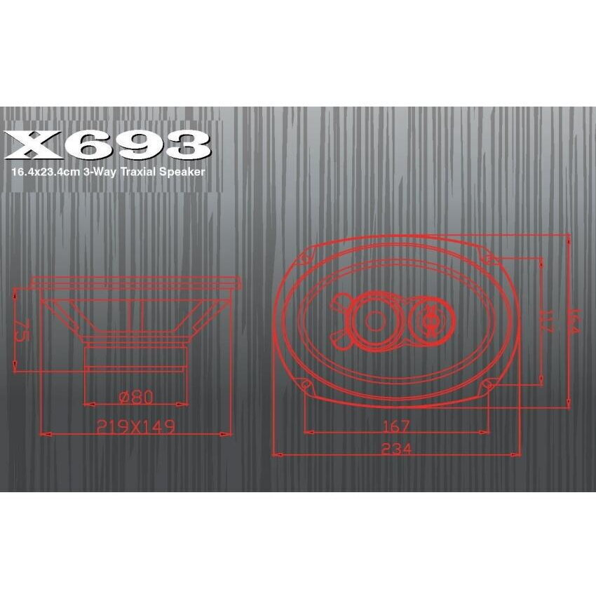 Οβάλ σετ ηχείων 3 δρόμων X693 από την Excalibur. Με μέγιστη ισχύ 500 watt και ισχύ RMS 100 watt. Ένα ποιοτικό σετ ηχείων με κορυφαίο ήχο.Χαρακτηριστικά:- Ηχεία 6x9 ιντσών.- Σύστημα: 3 δρόμων.- Μέγιστη ισχύς: 500W.- Μέγιστη ισχύς RMS: 100W.- Σύνθετη αντίσταση: 4 ohms.- Εύρος συχνοτήτων: 50Hz-20KHz.- Ευαισθησία: 90dB.- Μέγεθος: 16,4 x 23,4 cm / 6" x 9".- Βάθος: 75mm.