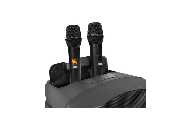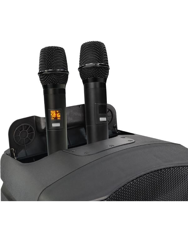 - 2 ασύρματα UHF μικρόφωνα με echo εφέ και χώρο αποθήκευσης μέσα στο ηχείο